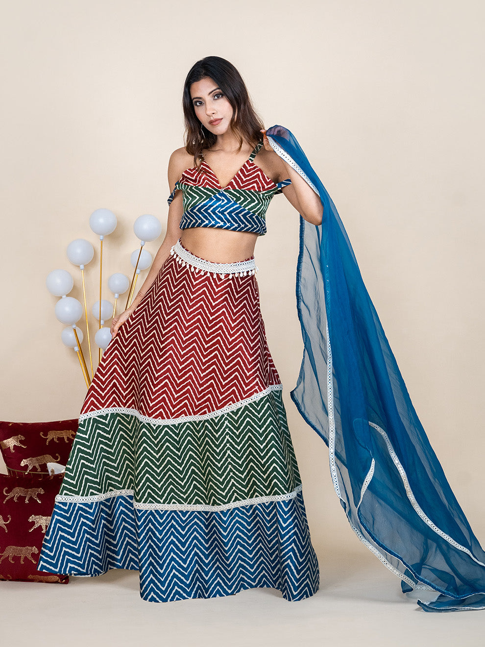Silk Lehenga to steal the show: Whether it be your best friend’s mehendi or sangeet, this elegant fusion of tradition and fashion is just enough to steal any occasion. The Mushroom Silk skirt with lace accents and a beautiful belt round out the outfit. Adding a blue organza dupatta with exquisite lace borders. This combination allows you to appreciate the fusion of colors, textures, and complicated accents while creating a statement for any special occasion. The leheriya silk lehenga is a trendy and contemporary alternative for people looking to stand out and show off their fashion-forward sense of style.