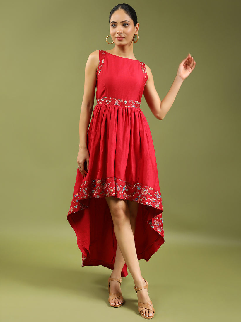 Change the vibe from gloom to mood with our designer ethnic red dress. Crafted from luxurious chanderi silk and adorned with intricate embroidery, this dress is a celebration of elegance and tradition. The sleeveless design and striking high-low hem create a unique silhouette that is both modern and timeless. The vibrant color combination adds a touch of radiance, ensuring you stand out at any festive occasion. Elevate your beauty and make a memorable statement with this enchanting ethnic dress that effortlessly blends cultural grace with contemporary style.