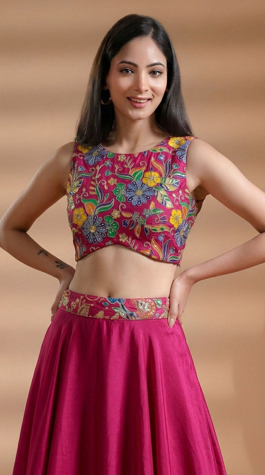 Azalea Pink Floral Embroidered Silk Skirt Set