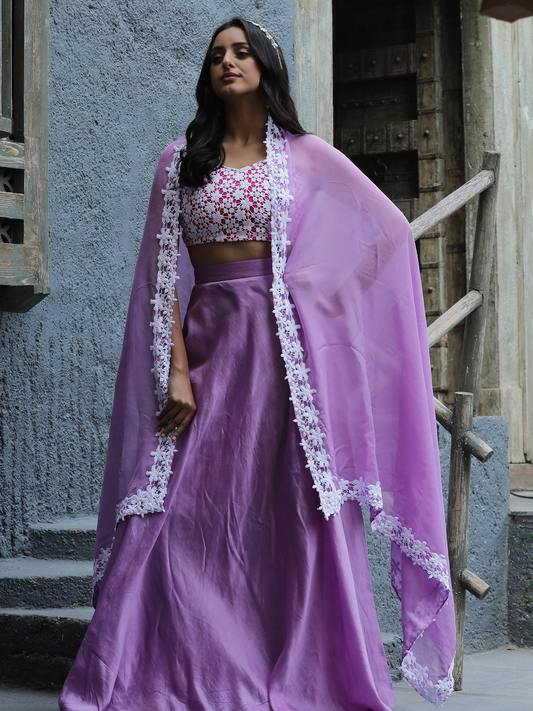 Pink and Purple Pure Silk Organza Dupatta with Embroidered Lace