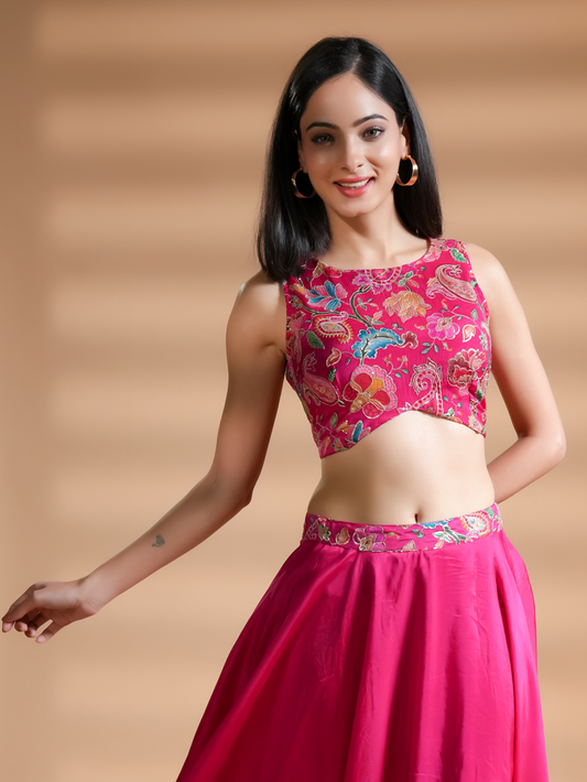 Azalea Pink Floral Embroidered Silk Skirt Set
