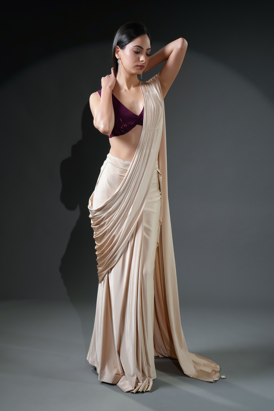 Exclusive Designer Ivory Ready-to-Wear Saree with Unique Drape in Luxe Fabric