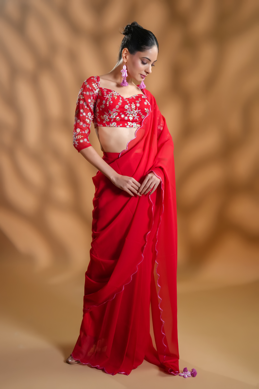Red Georgette Ready To Wear Saree With Embroidered Blouse Fabric and Tassels