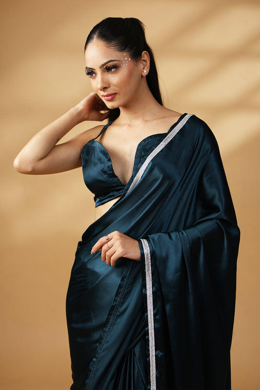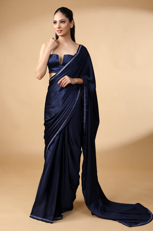 Princess Blue Lace Embellished Luxe Satin Saree with Unstitched Blouse