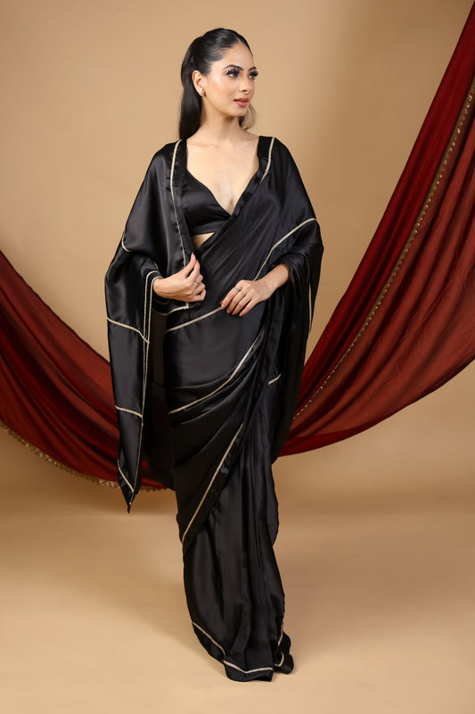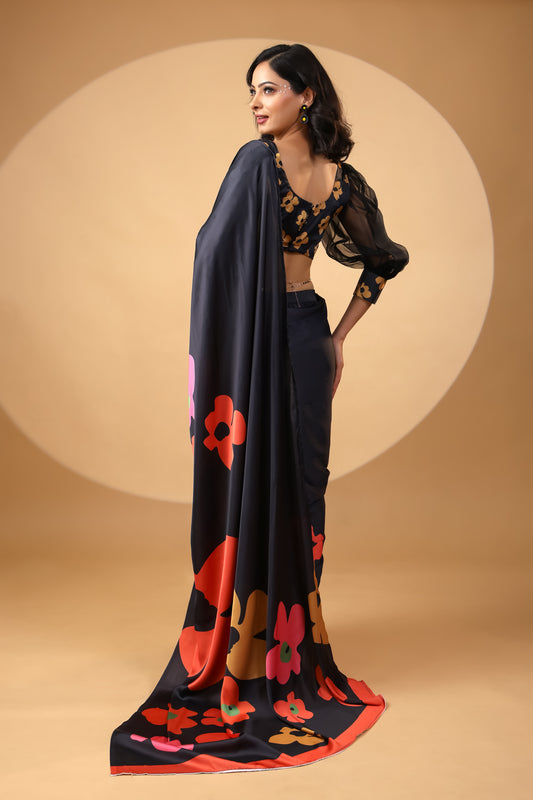 Black & Scarlet Bloom Satin Saree with Designer Blouse Piece