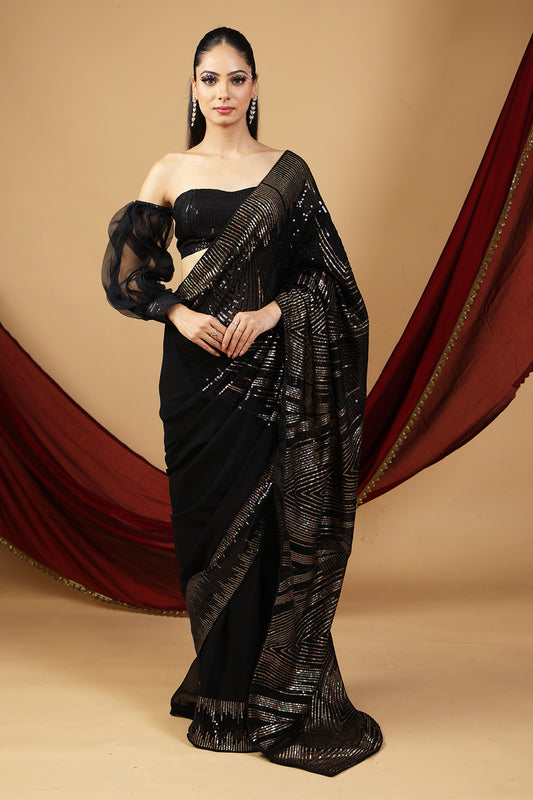 Midnight Sparkle Black & Gold Sequin Party Saree with Unstitched Blouse
