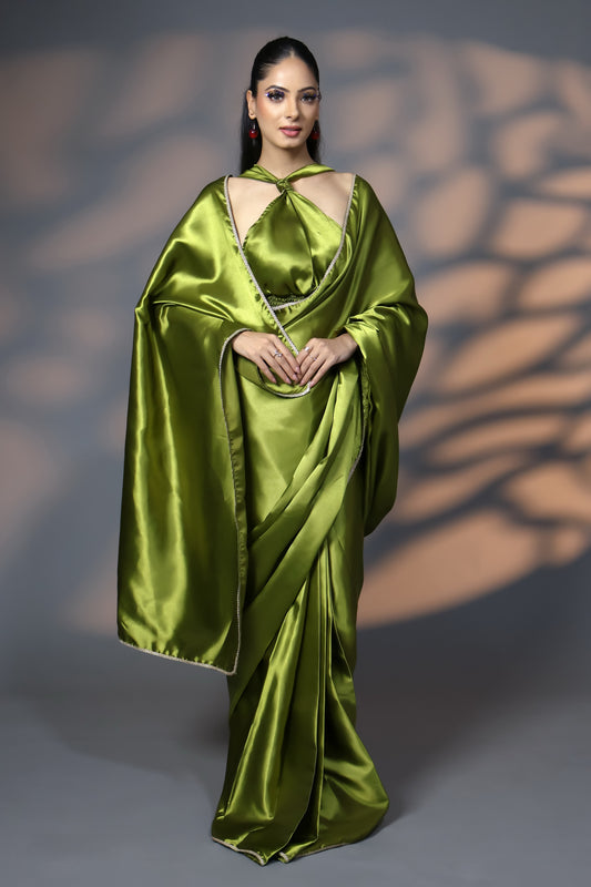 Olive Gold Luxe Satin Saree with Golden Embellishments and Blouse Fabric