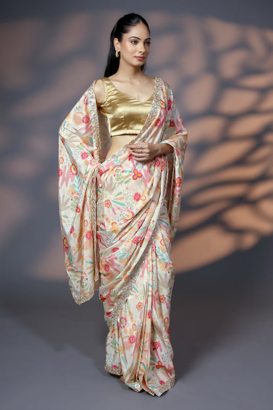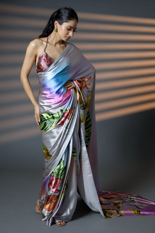 Silken Bloom Floral Printed Premium Satin Saree with Unstitched Blouse