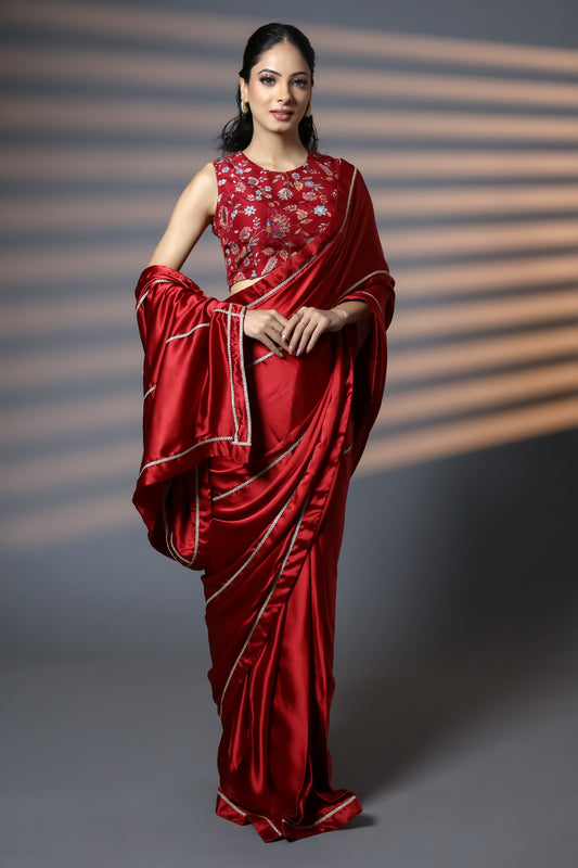 Luxe Red & Gold Embellished Premium Luxe Satin Saree with Blouse Piece