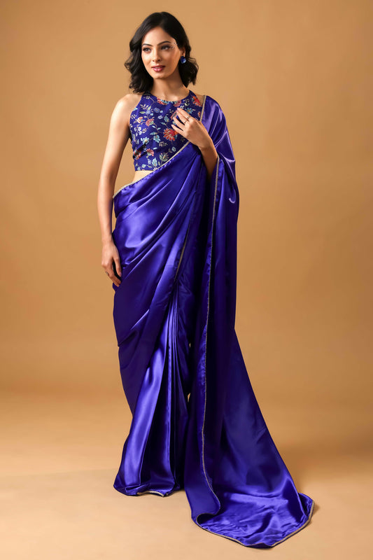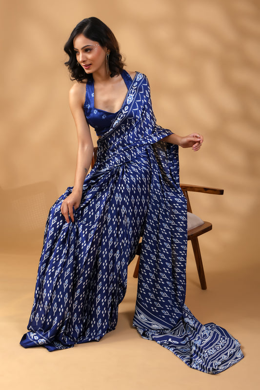 Indigo Whisper Satin Saree in Deep Blue Hues with Unstitched Blouse