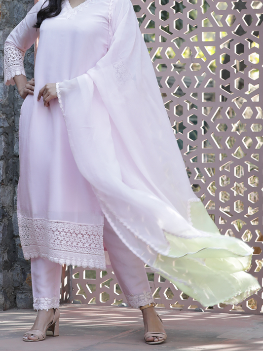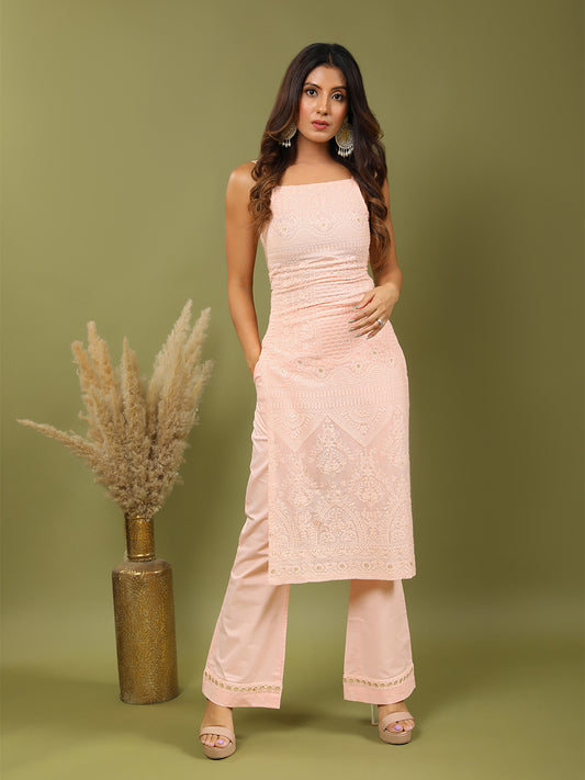 Peach Sleeveless Chikankari Embroidered Kurta & Pant Set