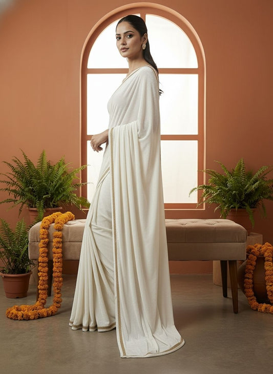 Classic Off-White Velvet Evening Designer Saree with Blouse Fabric