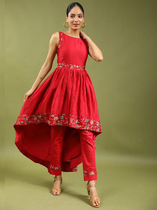 Floral Embroidered Printed Dazzling Red Silk Skirt Set