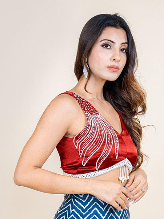 Maroon Silk Hand-embroidered V-neck Silk Blouse