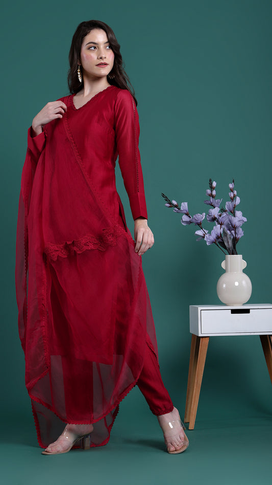 Elegant Black and Red Silk Suit Set with Dupatta (Set of 3)