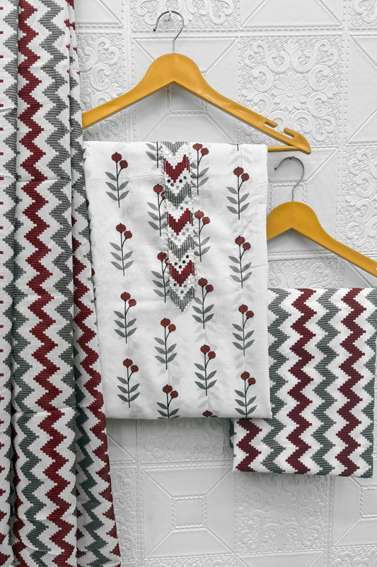 Maroon & Grey Geometric Chevron Cotton Unstitched Salwar Suit Set