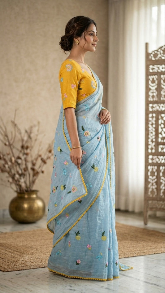 Aqua Blue Saree With Embroidered Blouse Fabric