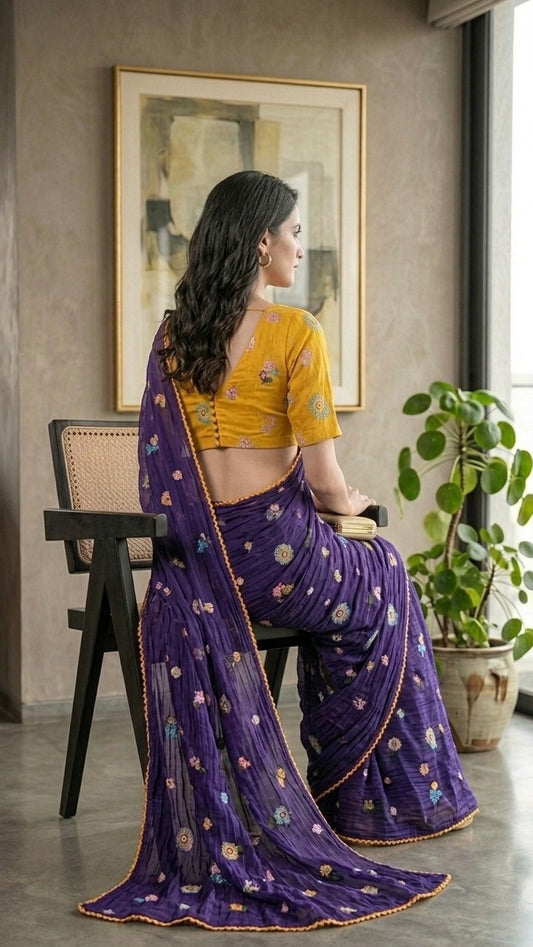 Rangrez Violet Floral Embroidered Mul Chanderi Saree