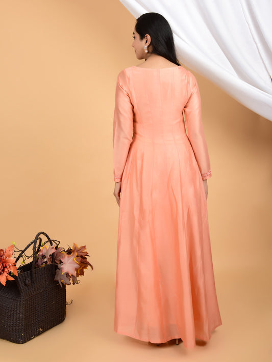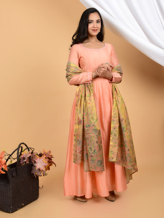 Step into elegance with our captivating peach anarkali kurta, adorned with delicate peach silk lace on its round neckline. Embrace sophistication with full sleeves featuring a charming floral print, perfectly complemented by a luxurious tissue Banarsi dupatta in a matching hue. This ensemble effortlessly combines grace and allure, making it a timeless addition to your wardrobe. Whether it's a festive celebration or a formal gathering, radiate poise and grace in this exquisite outfit. .