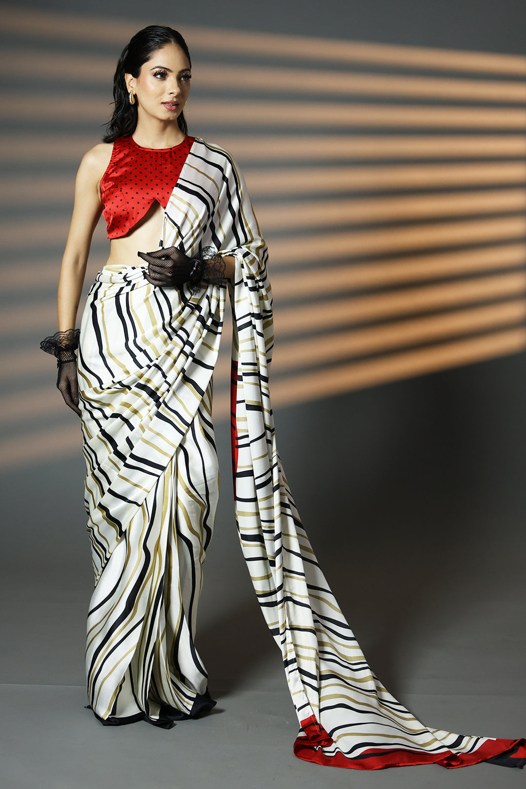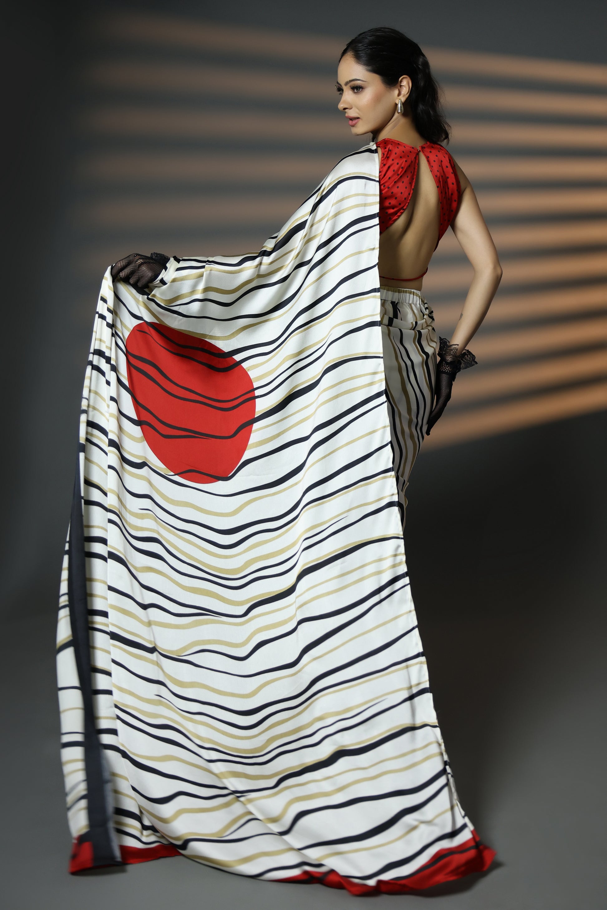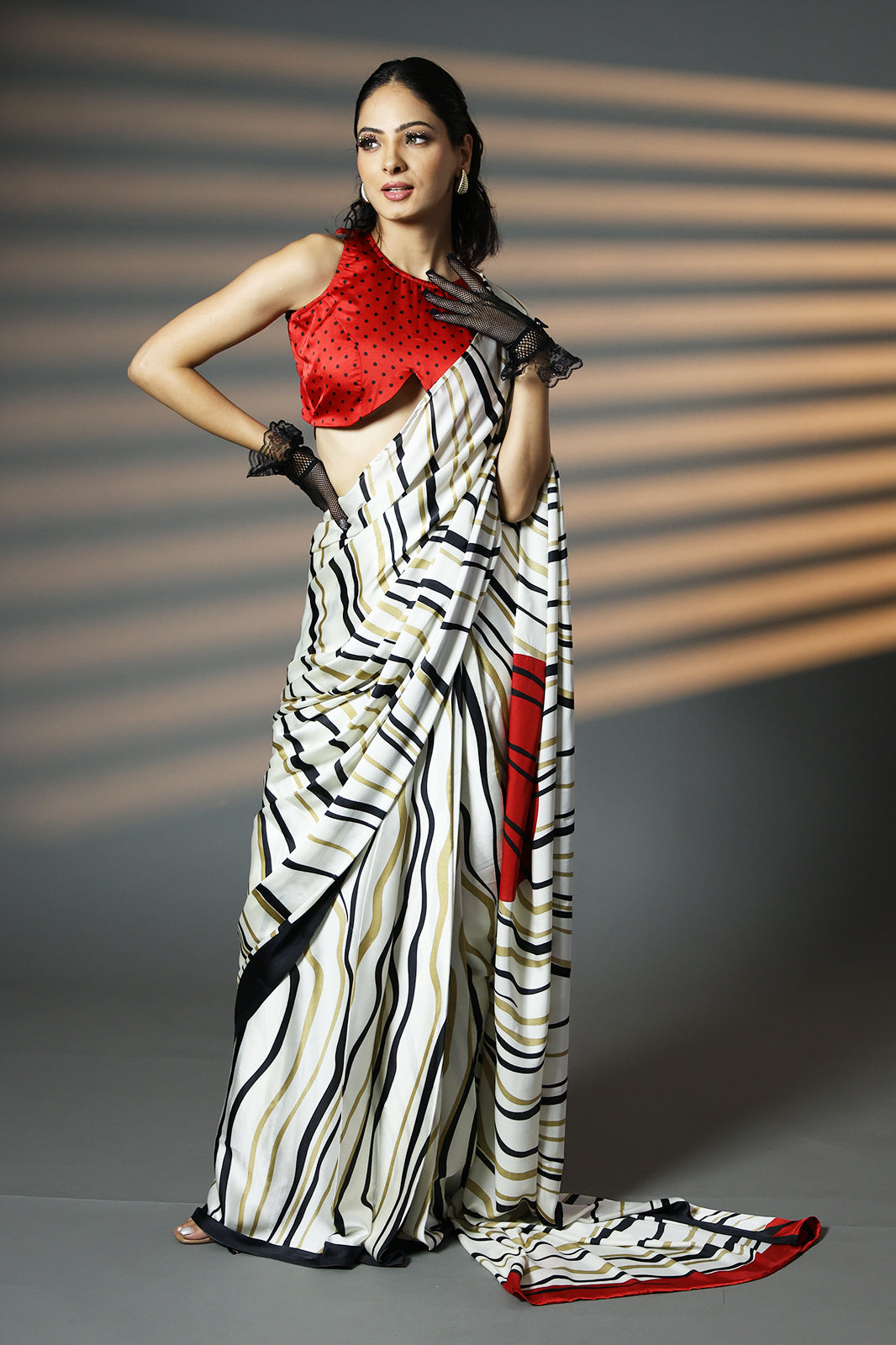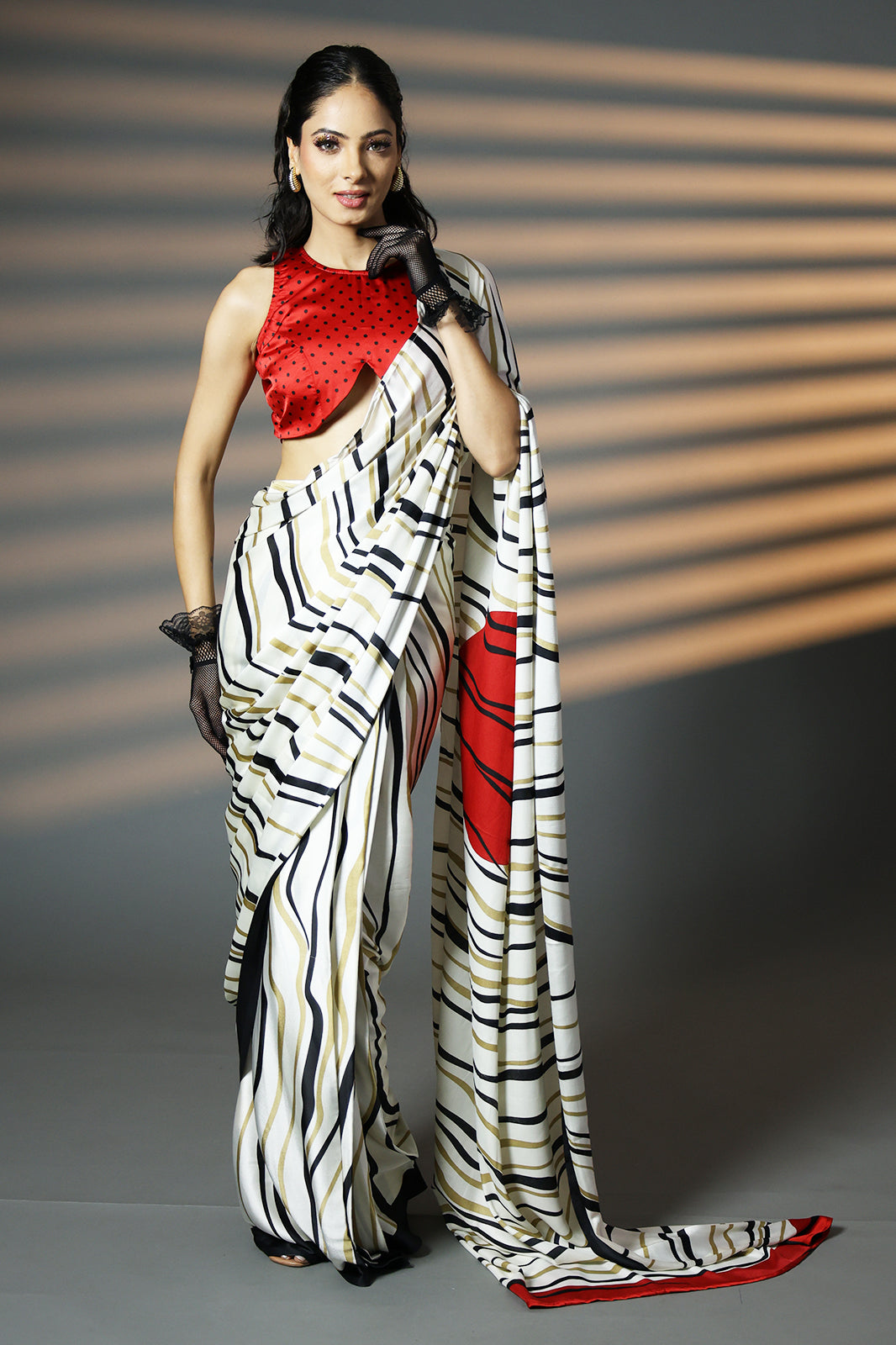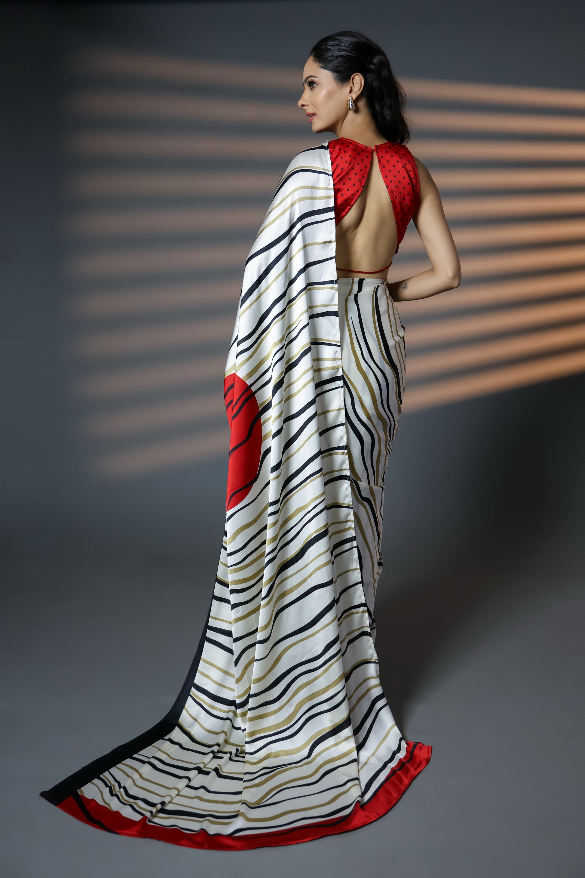 Redefine timeless elegance with this lightweight saree designed for the modern woman. Featuring a unique drape style at both the front and back, it blends contemporary flair with traditional grace. The soft, flowing fabric ensures a sleek silhouette and a comfortable fit, making it perfect for formal events, evening soirées, or festive celebrations. The saree comes with an unstitched satin silk blouse fabric as worn by the model.