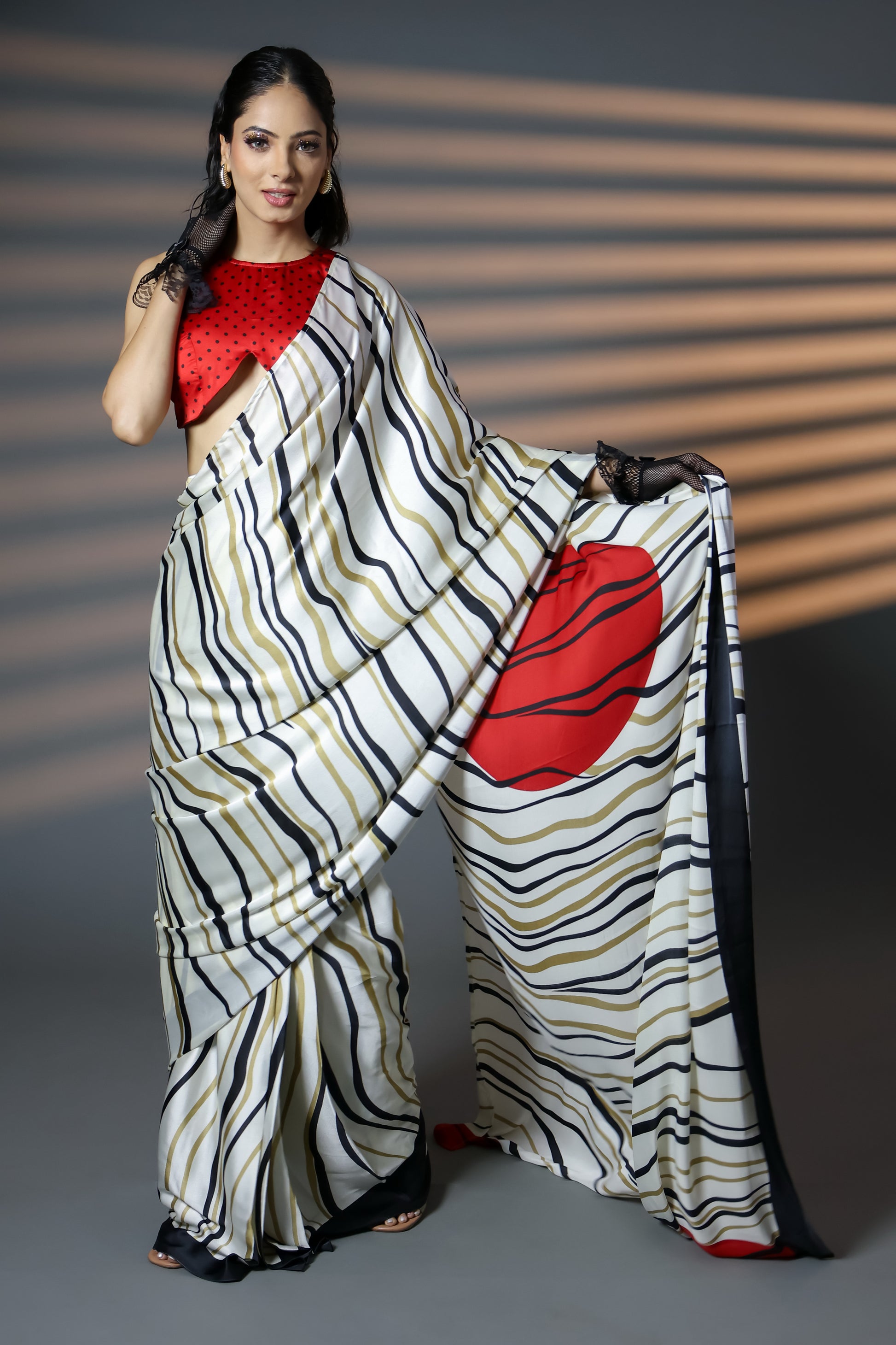 Black & Scarlet Bloom Satin Saree with Designer Blouse Piece