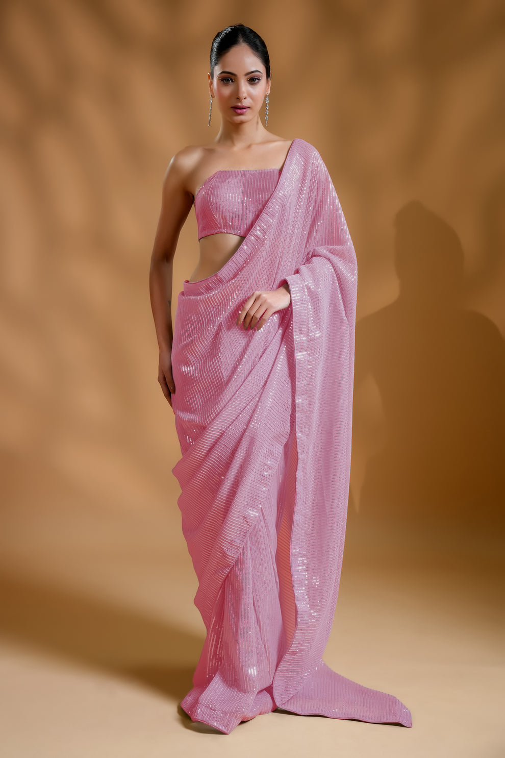 Fabric: Premium Georgette Color: Pink Texture: Finest and Lustrous Finish Occasion: Festive | Wedding | Elegant Gatherings Saree Length: 5.5m Blouse Length: 0.80m
