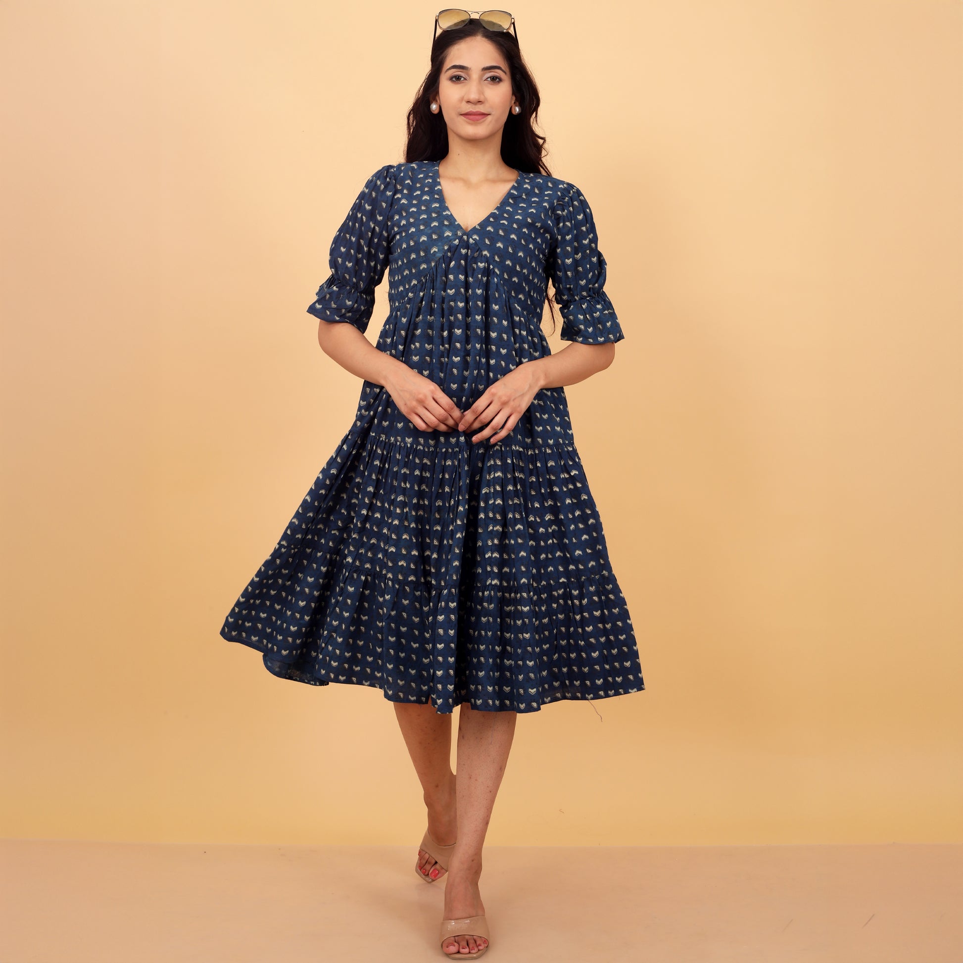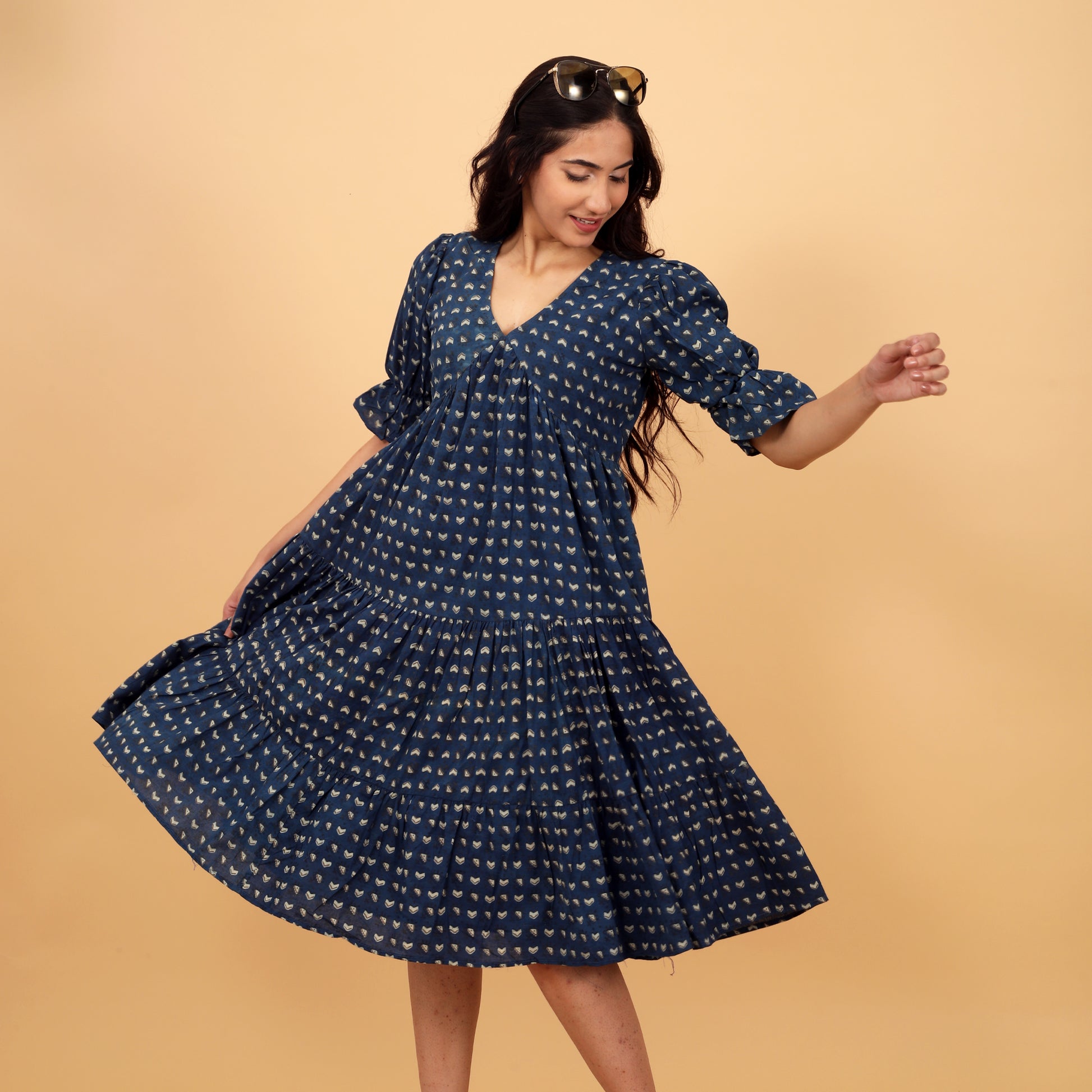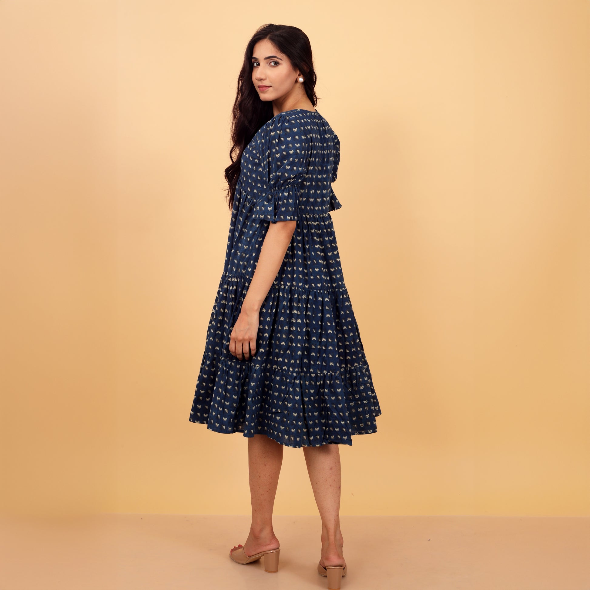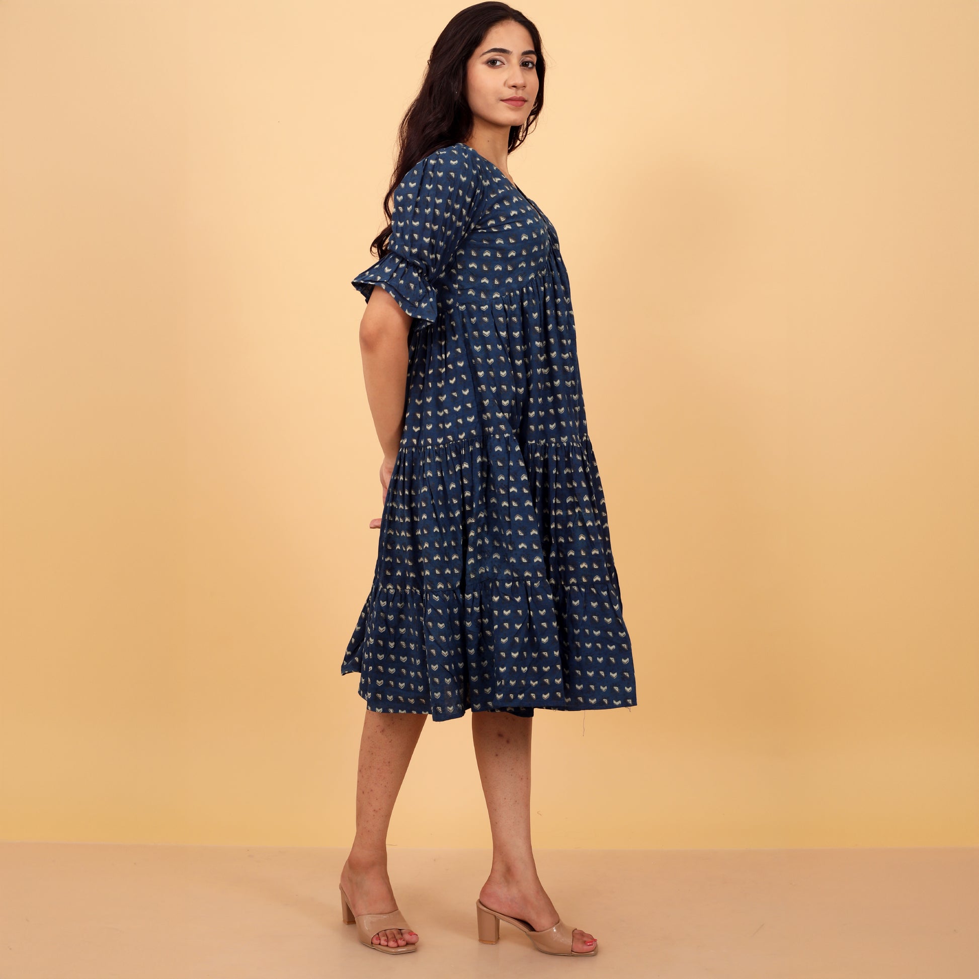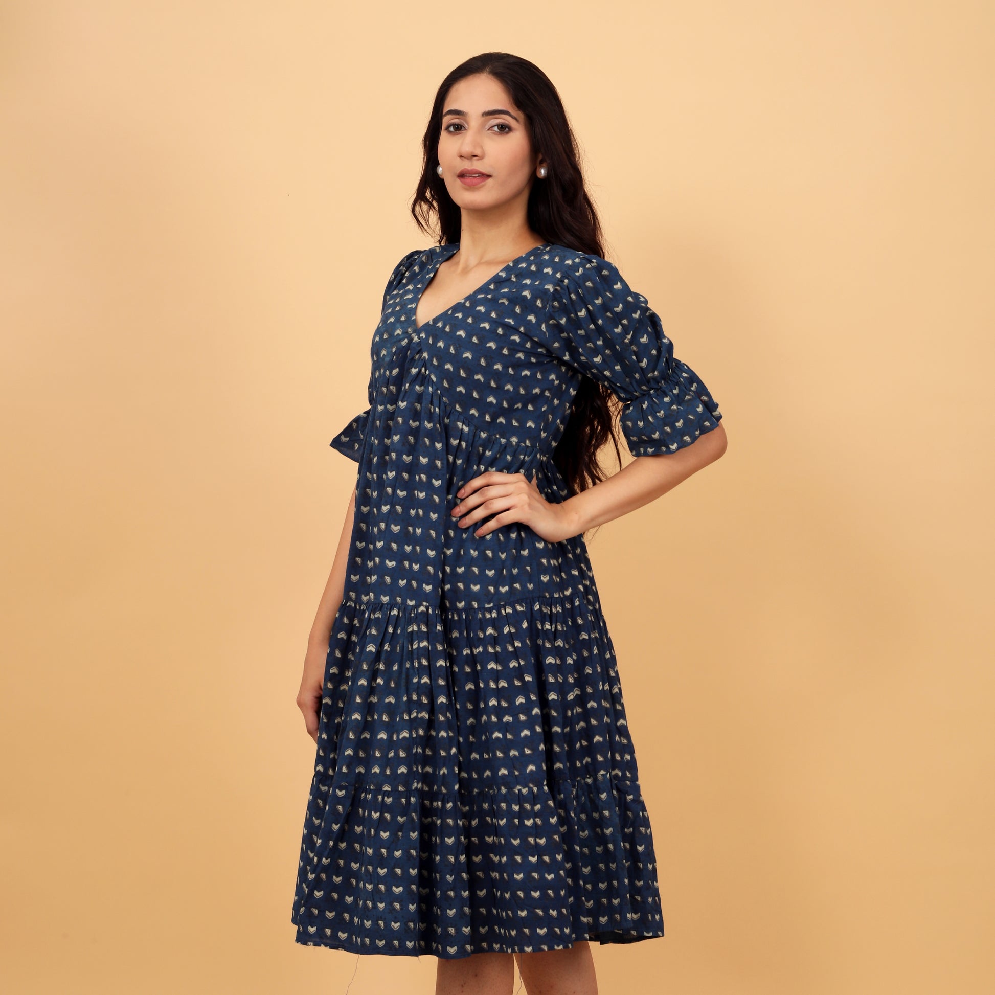 A charming block print cotton dress featuring a V neckline and bell sleeves. Designed with gathers for a flared silhouette, it includes a comfortable cotton lining, perfect for effortless elegance and style. Ideal for both casual and special occasions.