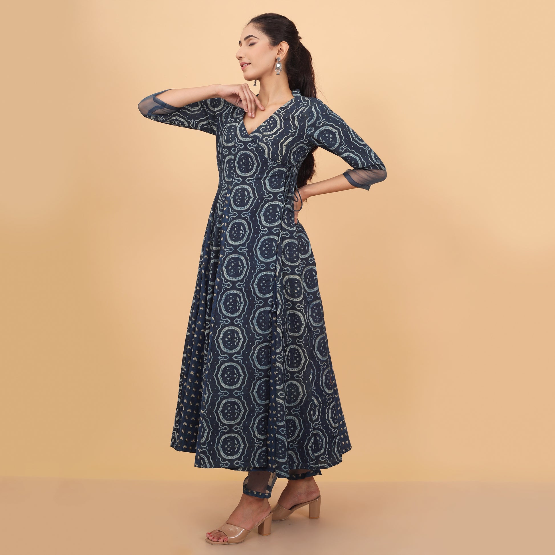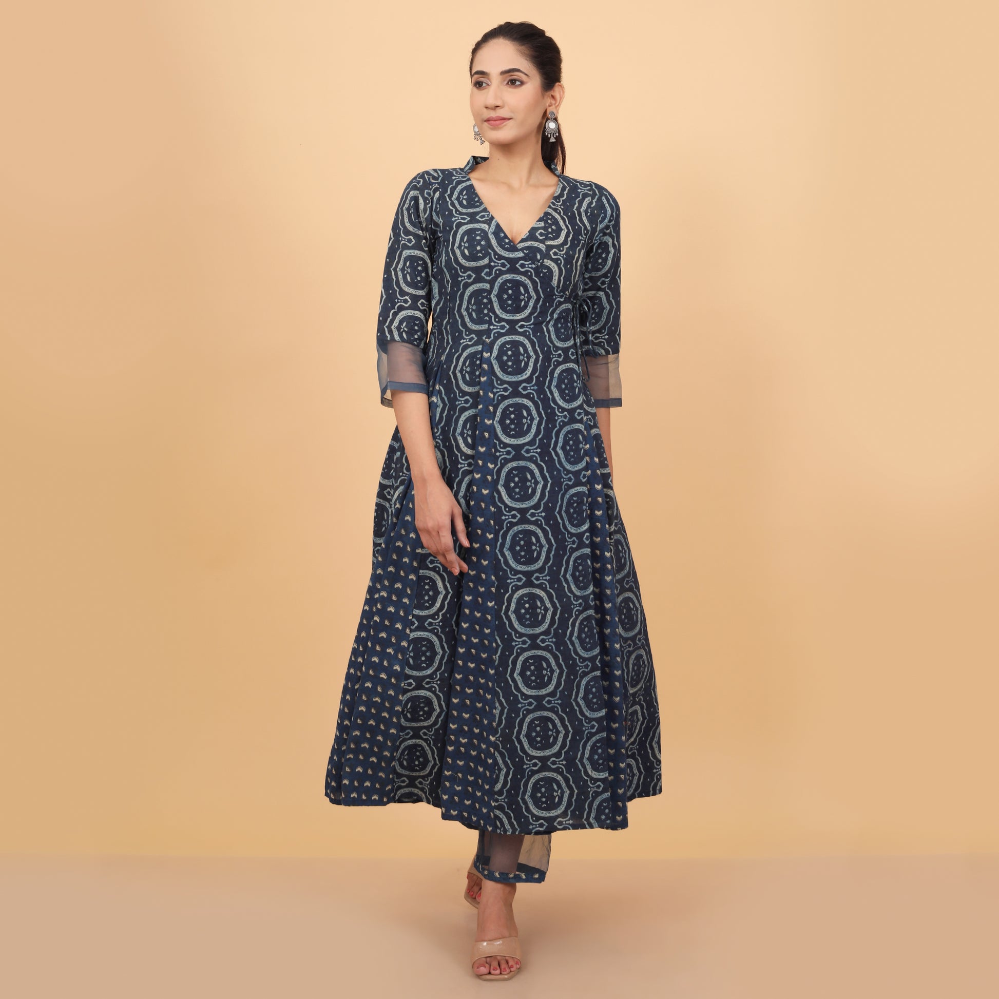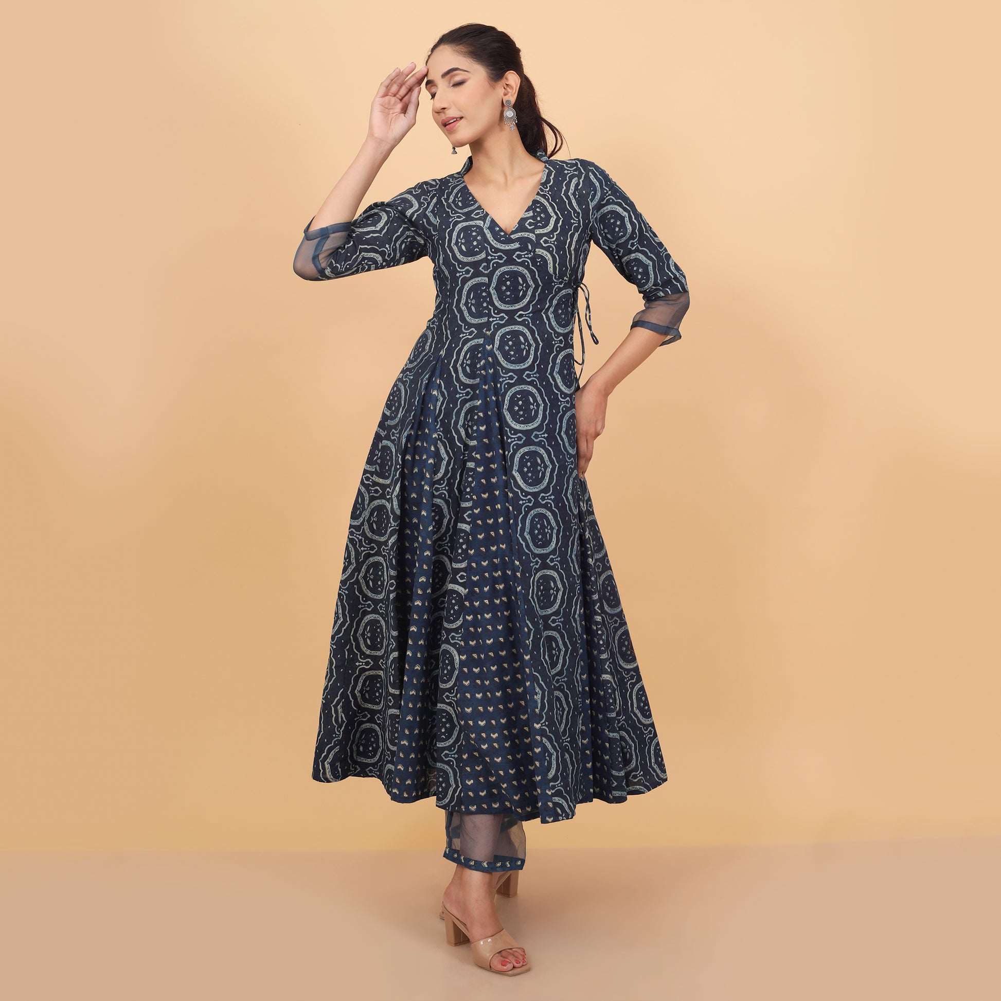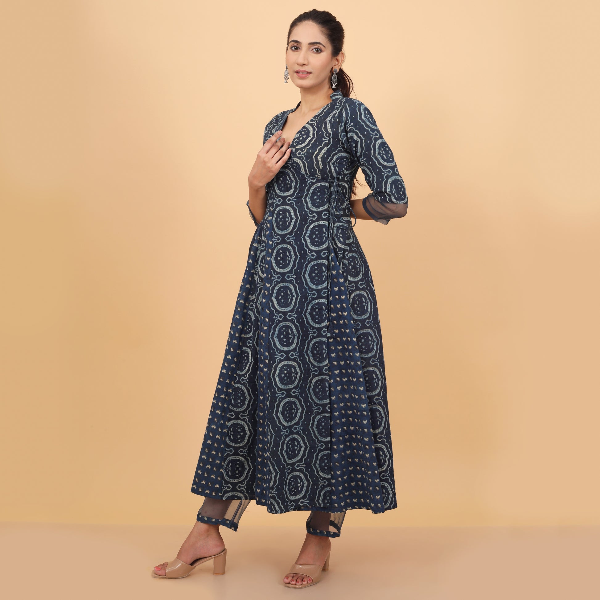 This cotton ethnic printed angrakha kurta and pant set features three-fourth sleeves and organza detailing at the bottom. The printed pants also have organza accents, creating a harmonious blend of traditional and contemporary styles.