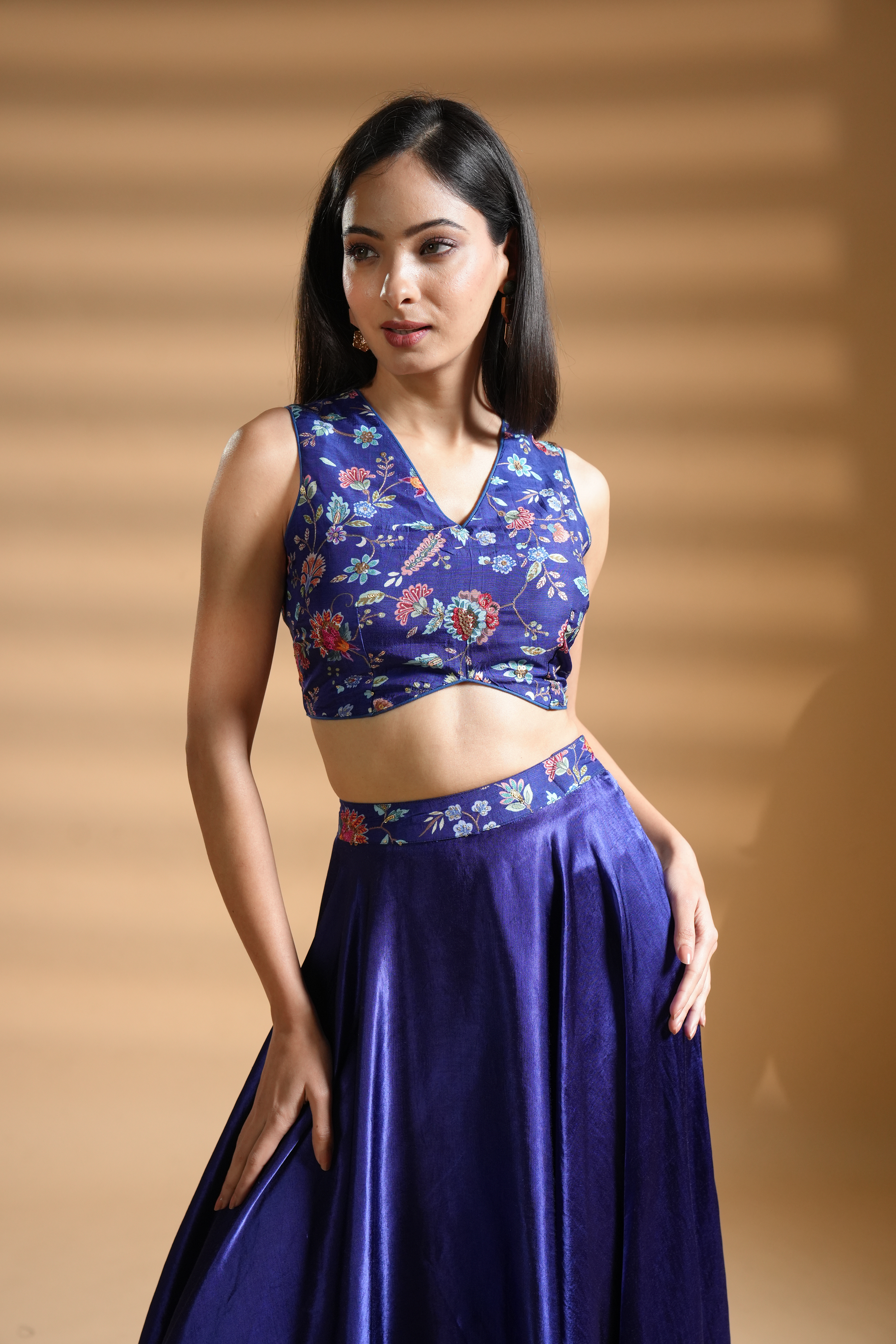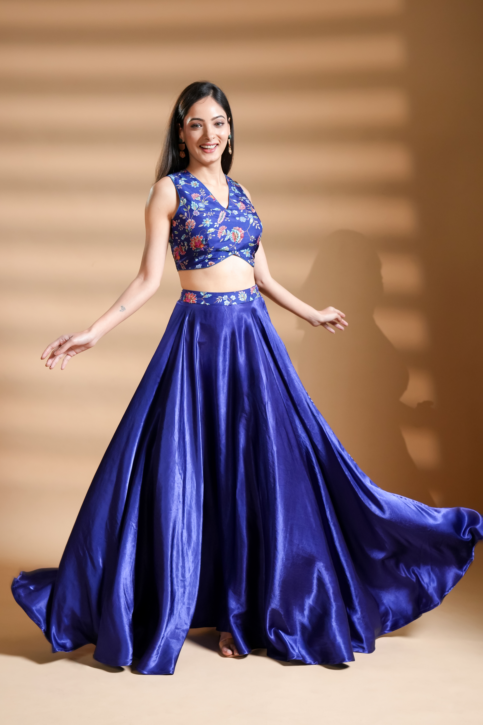 This striking royal blue lehenga choli set is perfect for making a statement at any special occasion. Taste of elegance can be seen in this chinon top and mushroom silk skirt. Finished with a lining in both top and skirt, this set is a showstopper. The V-neck sleeveless top expels your beauty from within and adds liveliness to the outfit. Fashion is all about sensuality and it is clearly visible in this creation.