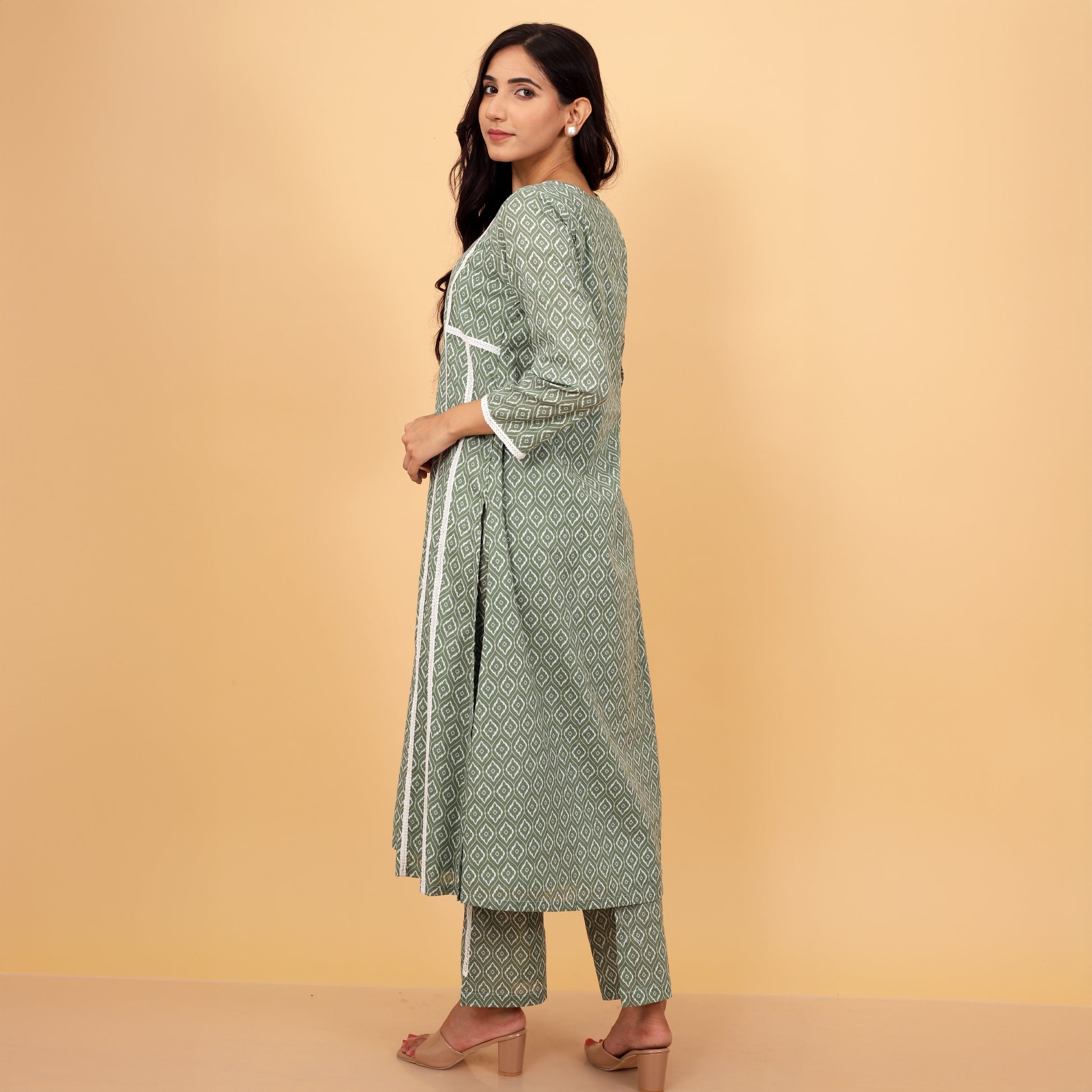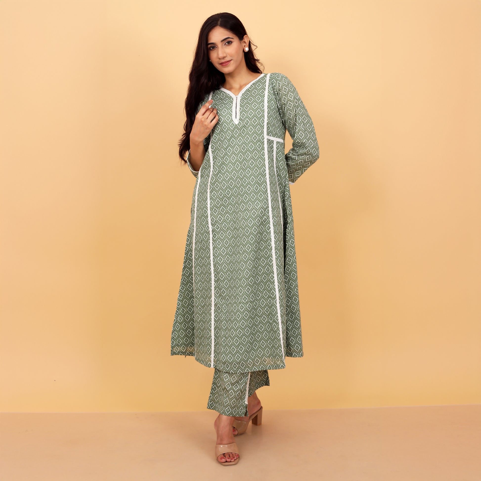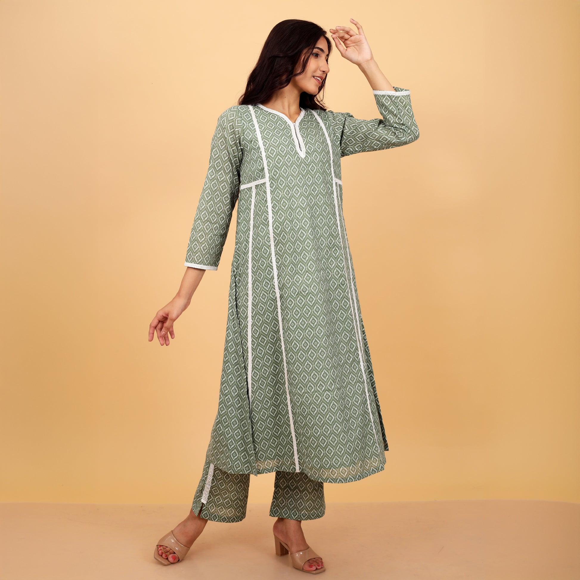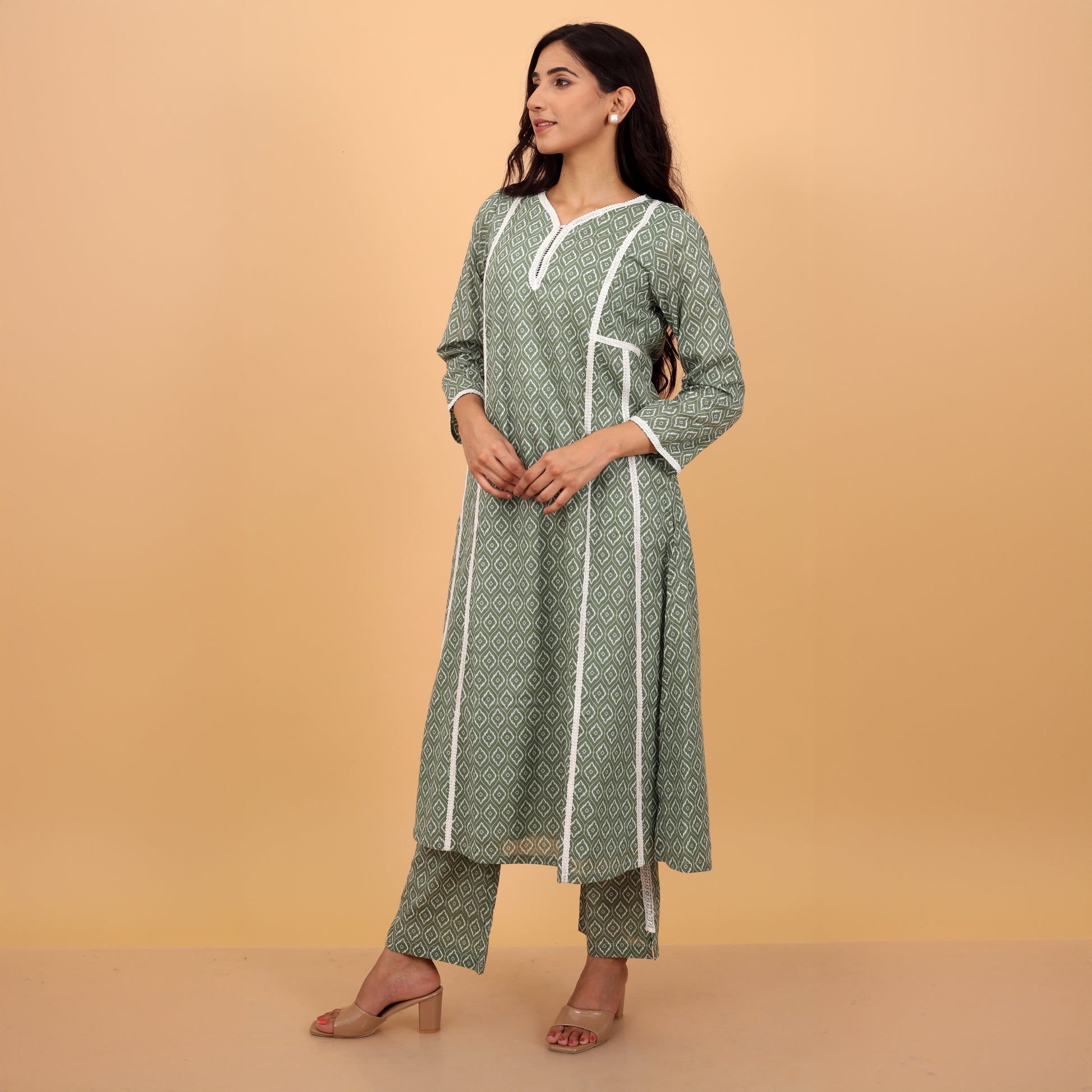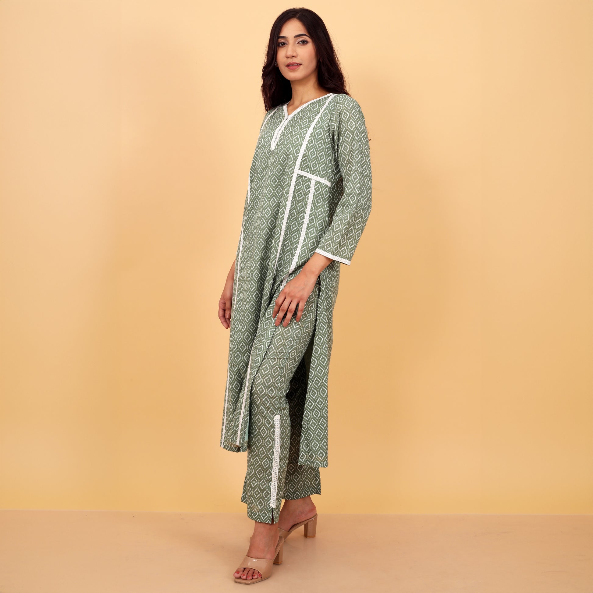 This Ekat cotton print kurta and pant set features a flattering V-neck and full sleeves. Enhanced with luxurious silk lace work and a comfortable cotton lining, it seamlessly blends elegance and comfort for a chic, timeless look.