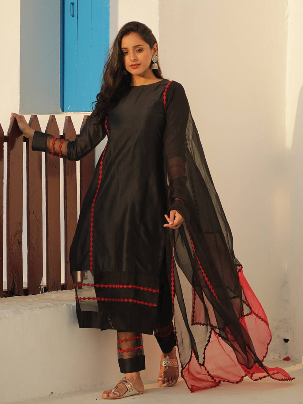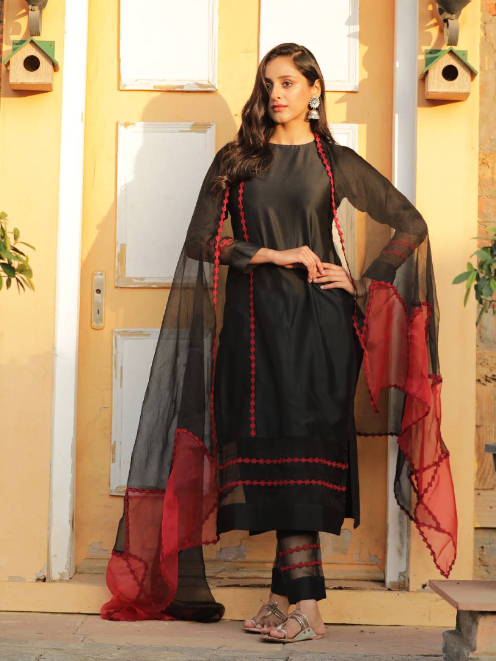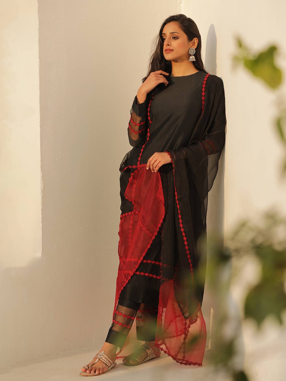 Elegant Black and Red Silk Suit Set with Dupatta (Set of 3)