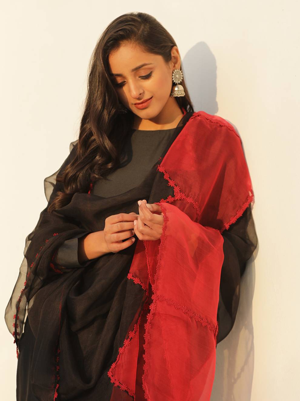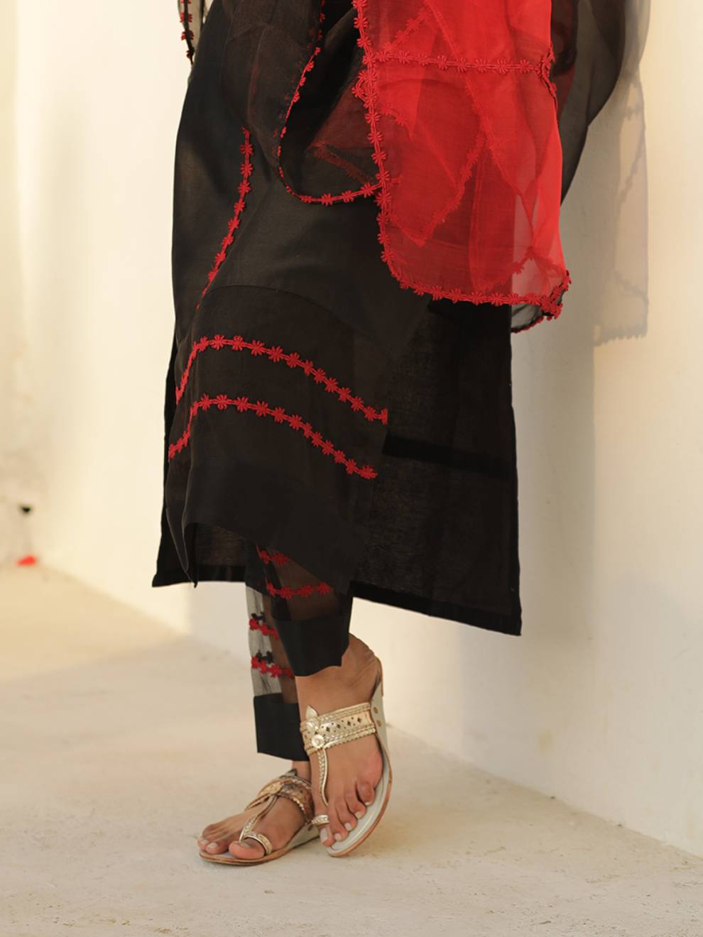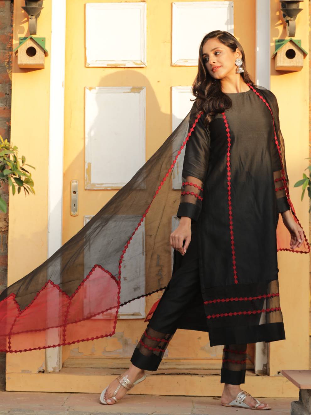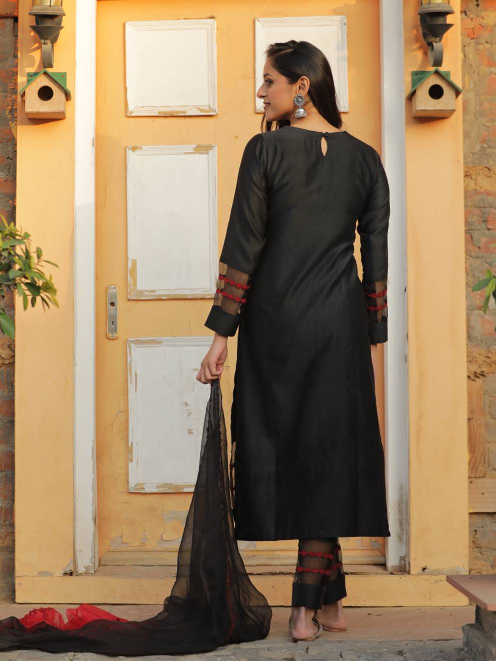 Elegant Black and Red Silk Suit Set with Dupatta (Set of 3)