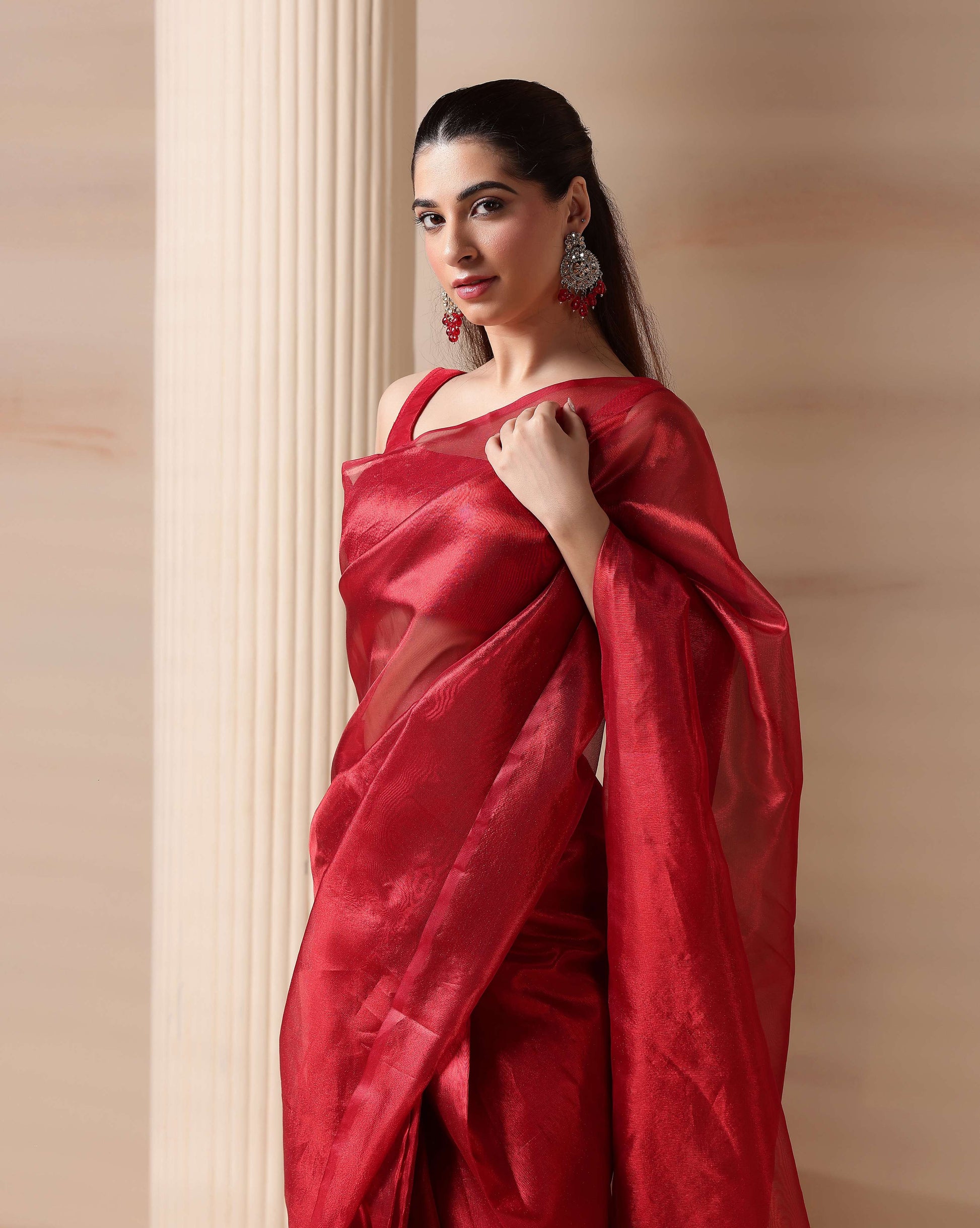 Elegant Red Glow Premium Tissue Saree with Blouse Fabric