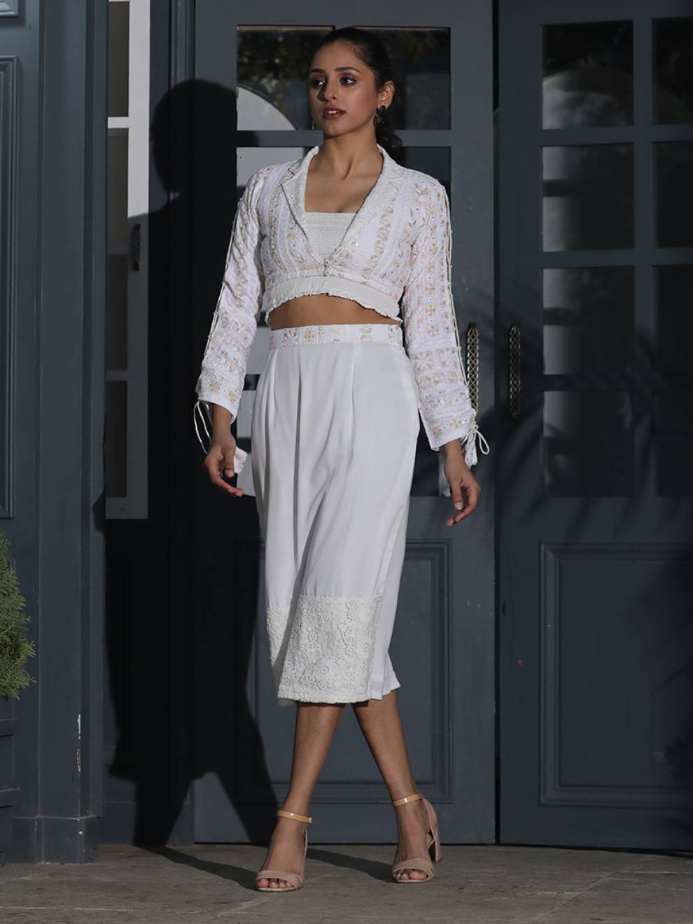 This multi-colored chikankari embroidered white jacket is the show stealer. The multicoloured jacket is beautified with an embroidered lace collar and a tie-up design in full sleeves. The jacket is provided with heavy double cotton lining for thick jacket look.