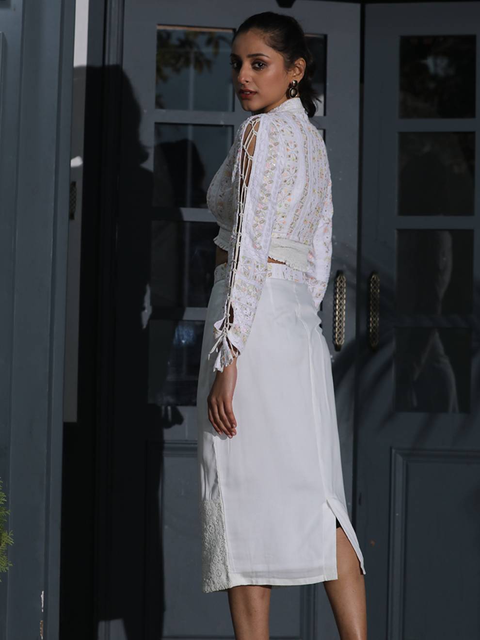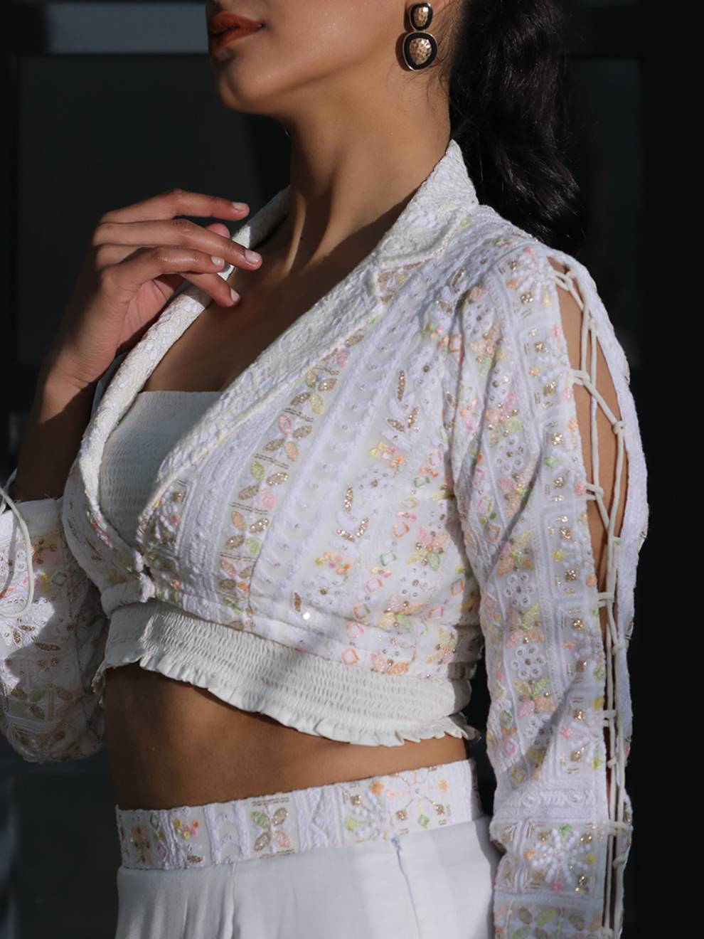 This Multicolor Jacket, top and skirt are the show stealers. Take the fashion game a notch up with this georgette fully embroidered Chikankari white ensemble. The multicolouredξjacket is beautified with a lace collar and a tie-up design in full sleeves. The dress is completed with a stunning pencil skirt with lace on the bottom. The skirt belt also comes in georgette chikankari with modal fabric. Donning this dress, shades on your eyes and you are a sight to behold! What else do you need, girl?