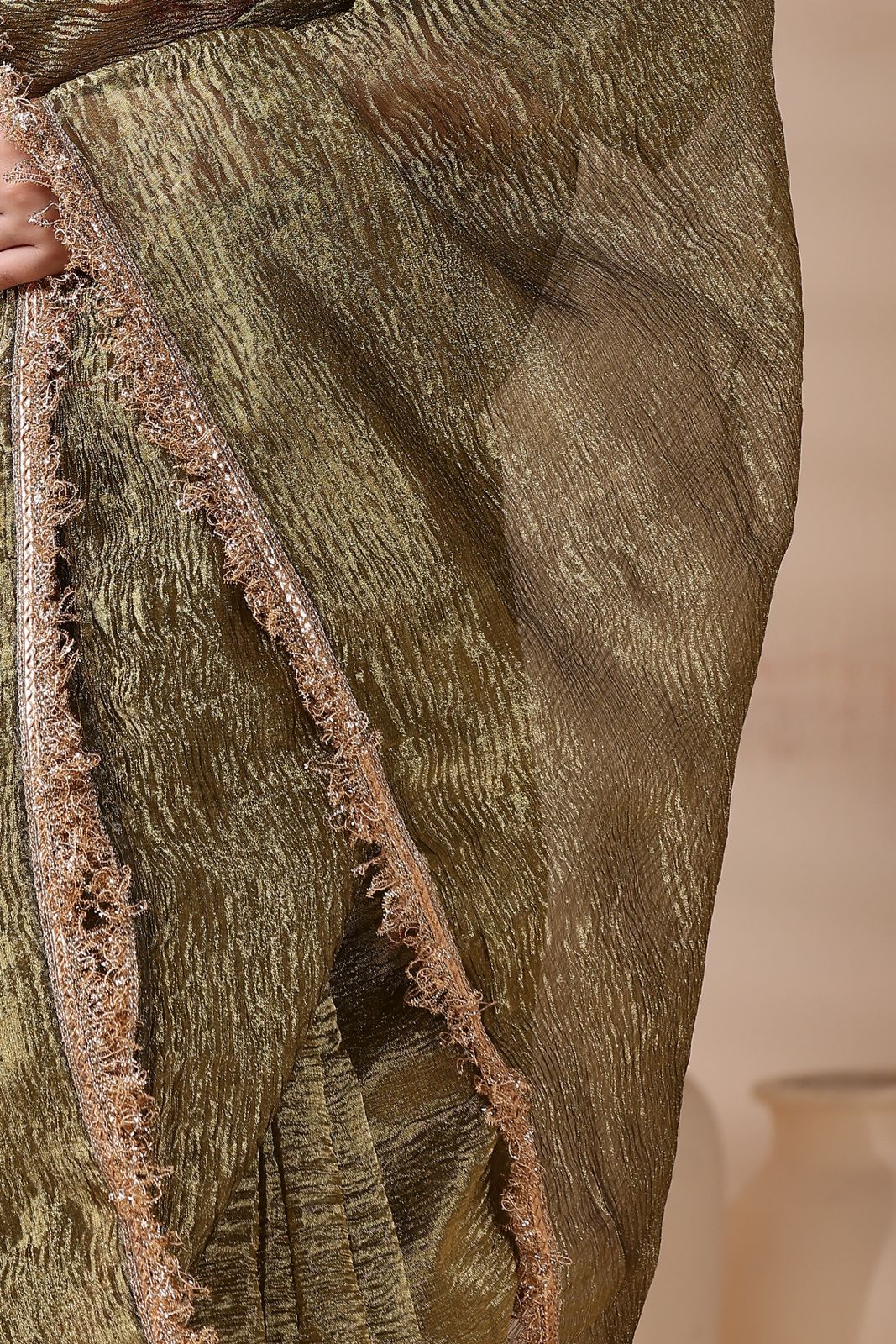 A mesmerizing green crush tissue silk saree that glows with understated grandeur. Perfect for evening elegance or festive occasions, this saree speaks the language of quiet luxury and refined grace.
