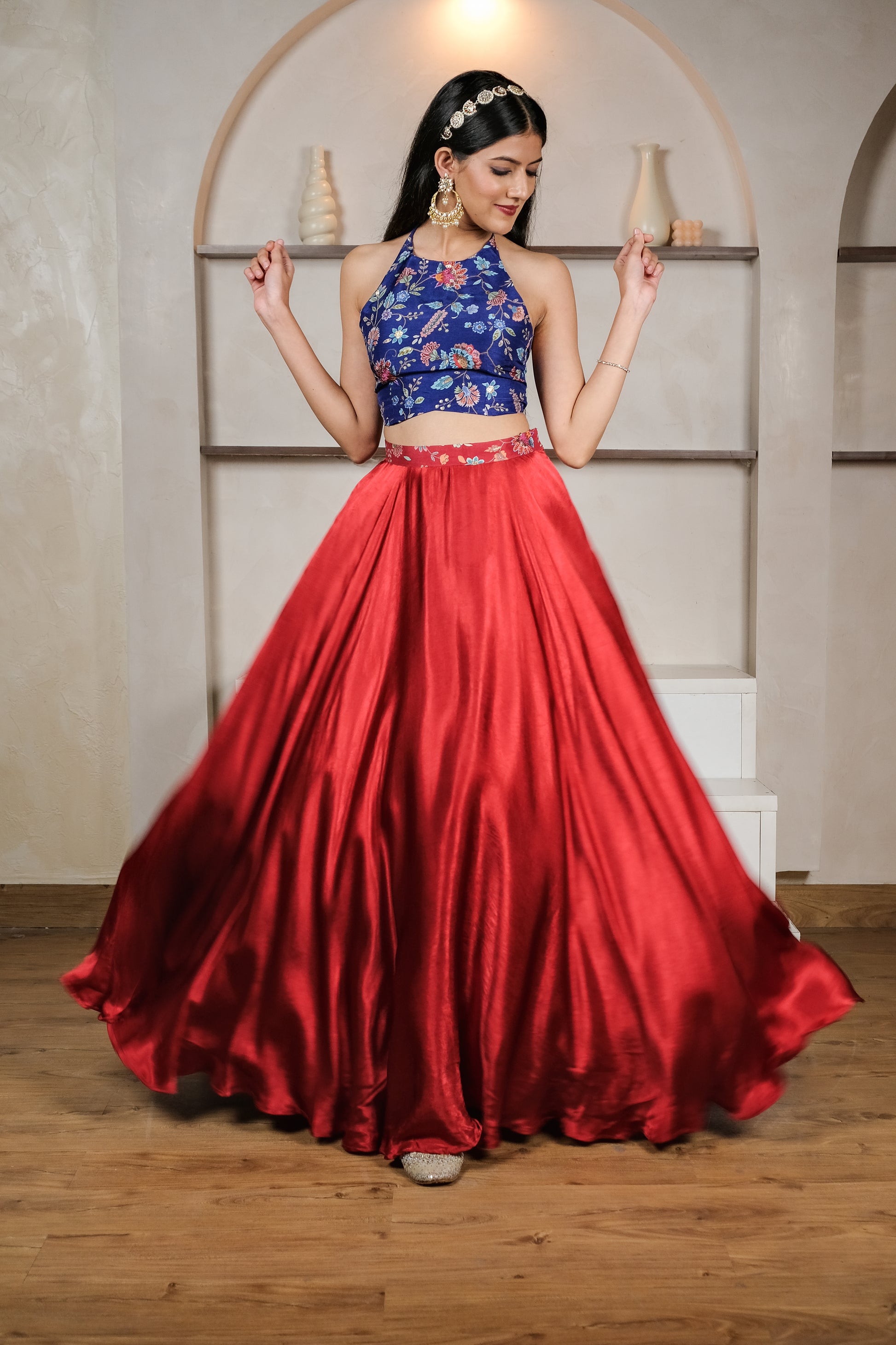 Perfect for this festive season, dress up in this elegantly designed blue and red floral embroidered skirt set. Suitable for wedding events, the halter neck detailing with floral embroidery in chinon top is the center of attraction. Withξgazi silk skirt, this outfit will surely win the hearts of many. So, go ahead and enhance your look in our wonderful collection of top and skirt set.
