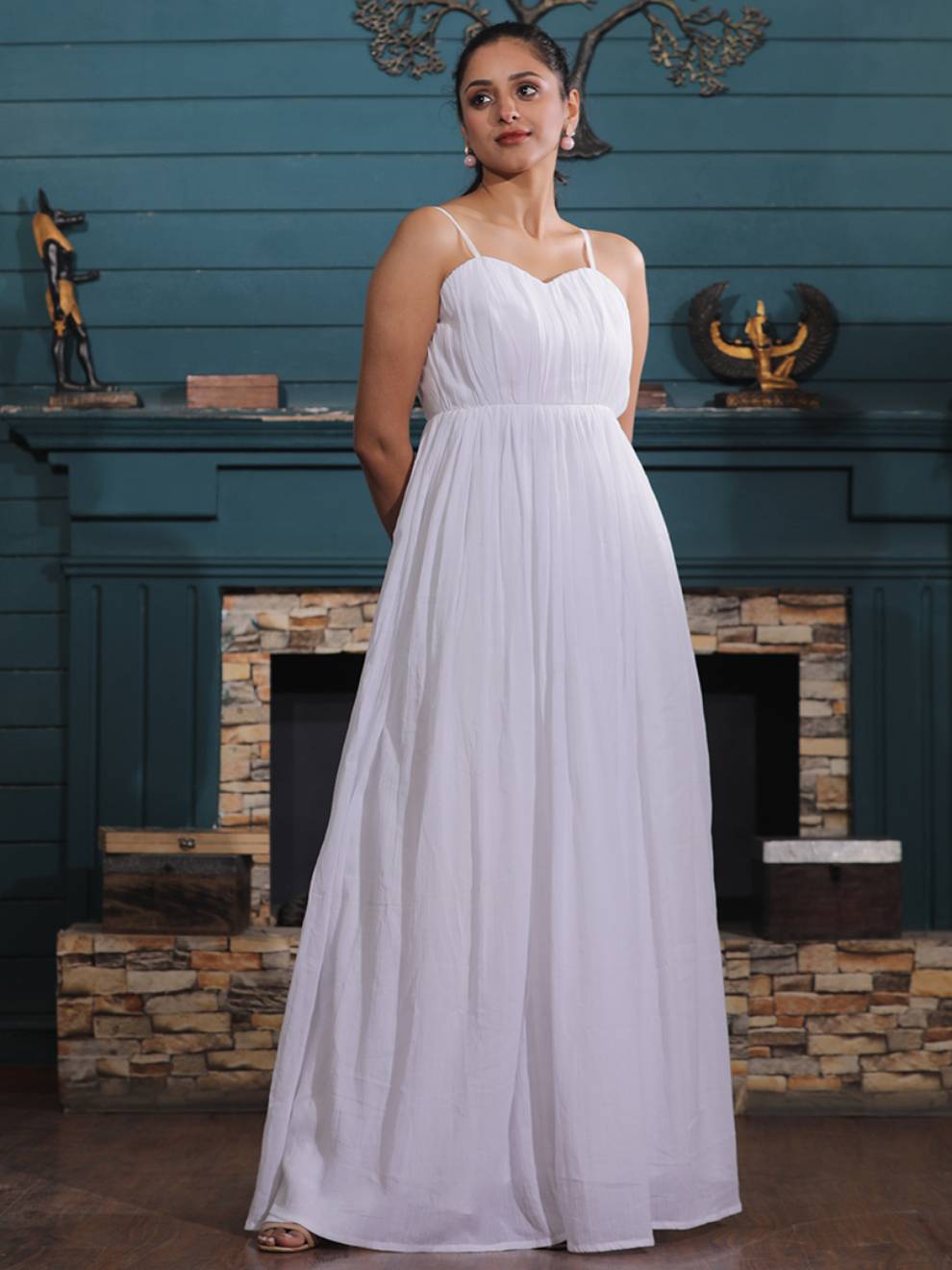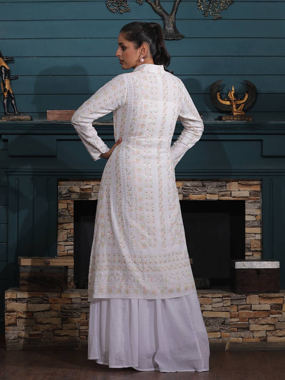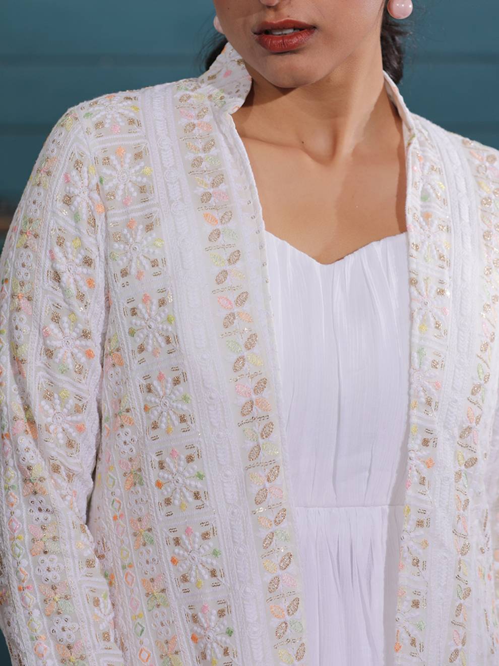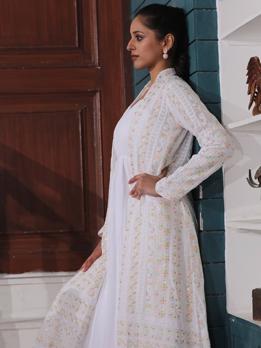 Step up your style game with this beautiful chikankari jacket set from the Handme collection! Crafted with intricate hand-embroidered designs, this stunning set will make you the envy of any occasion. Perfect for special occasions or everyday wear, the white strapped long gown inner and multicolored chikankari jacket with full sleeves will add a touch of elegance to your look. Style it with your favorite earrings, bangles, and necklace to complete the look. Get ready to look your best with a chikankari jacket set! The perfect combination of elegance and grace, it's the perfect way to make a statement on any special occasion. Make heads turn and stand out from the crowd in this timeless classic!