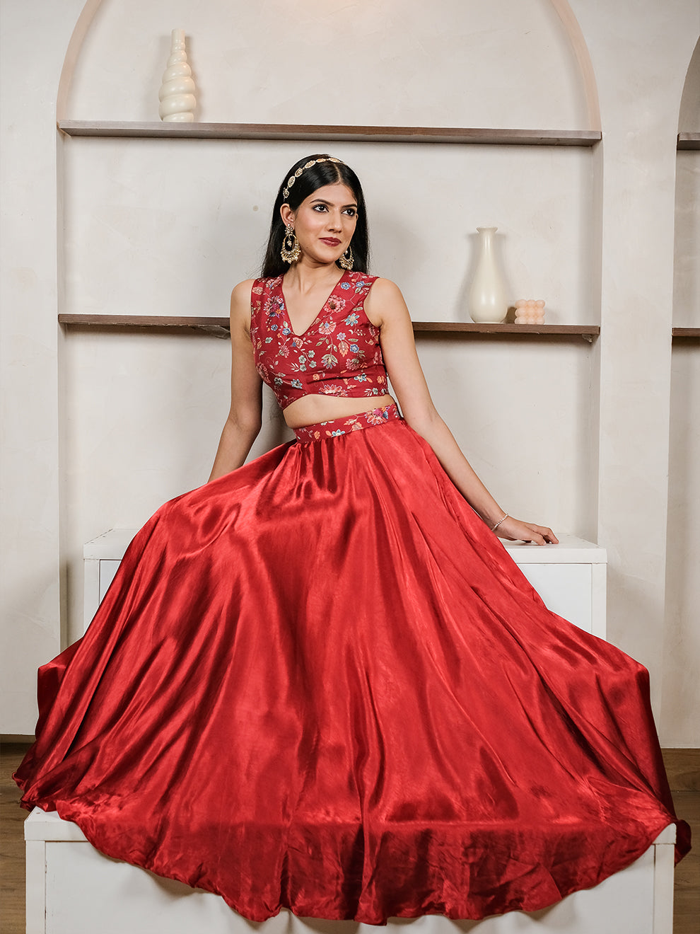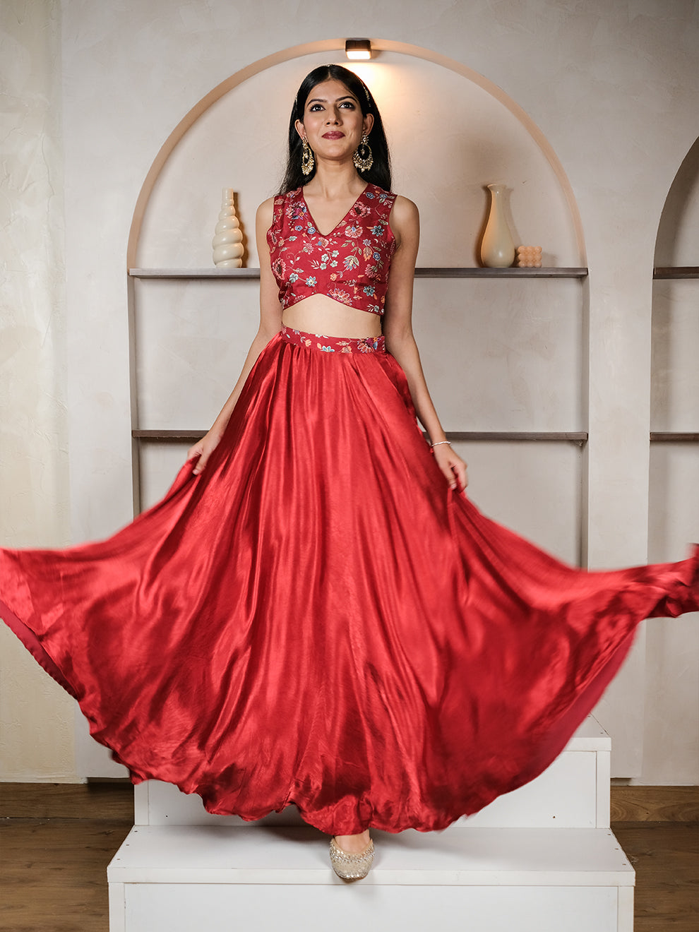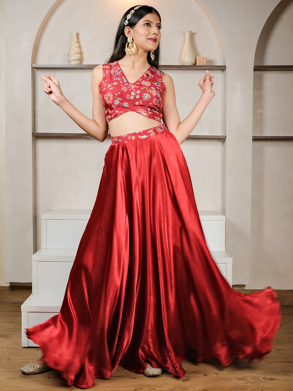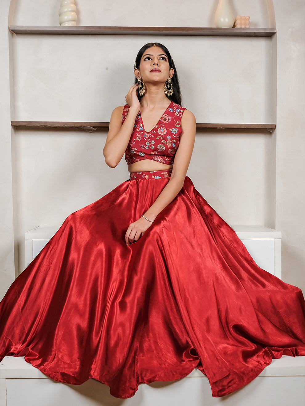 Floral Embroidered Printed Dazzling Red Silk Skirt Set