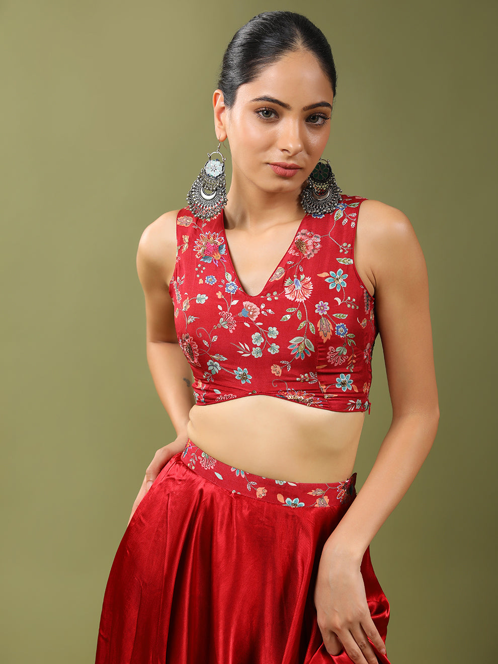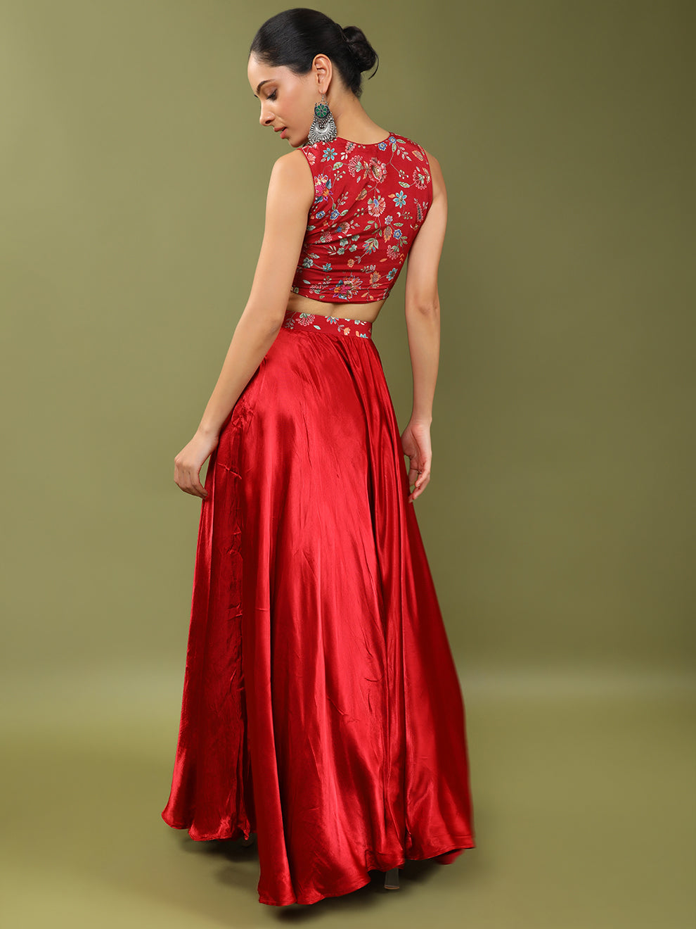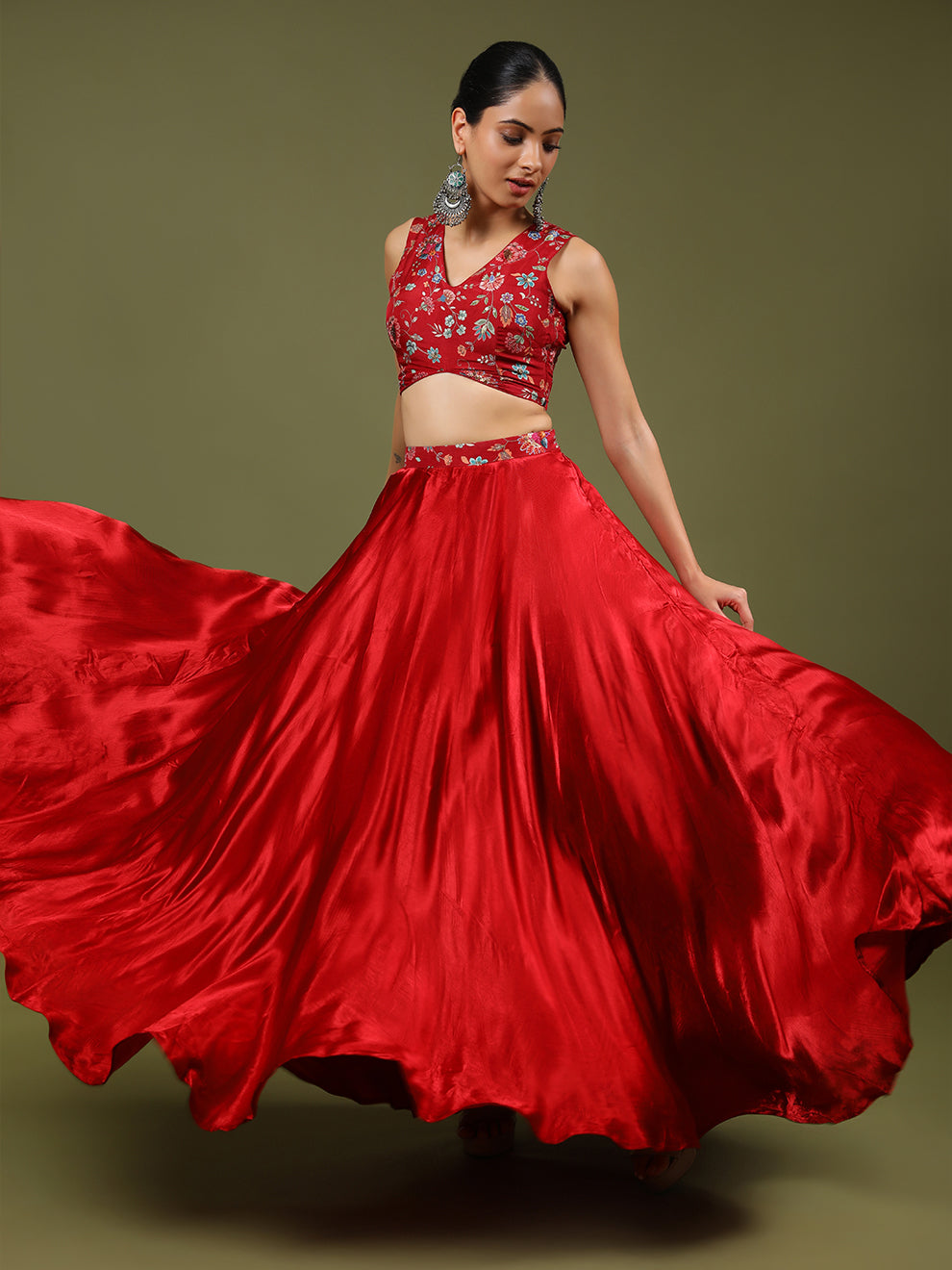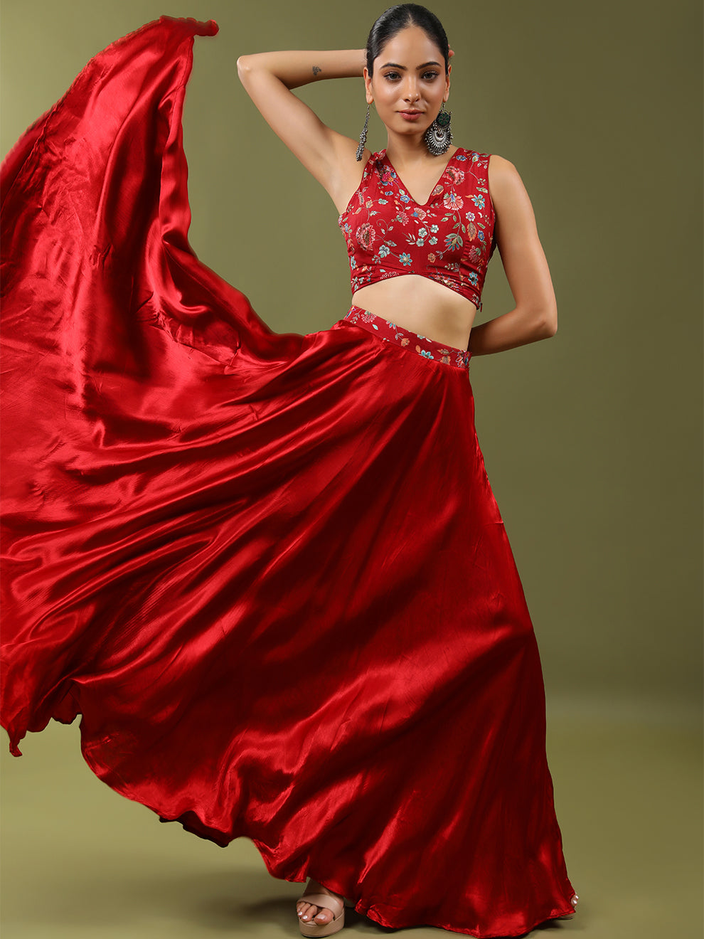 Floral Embroidered Printed Dazzling Red Silk Skirt Set