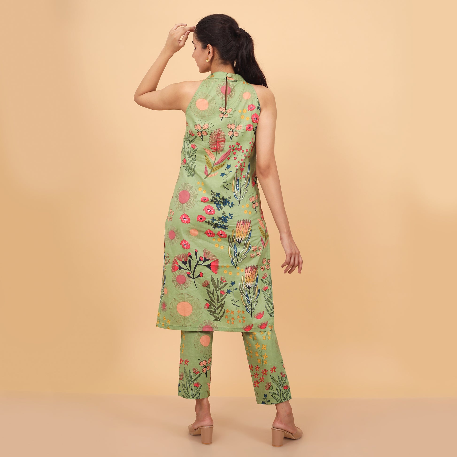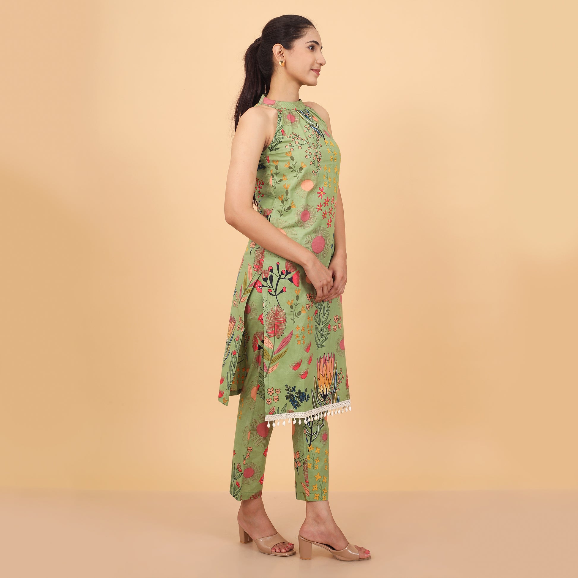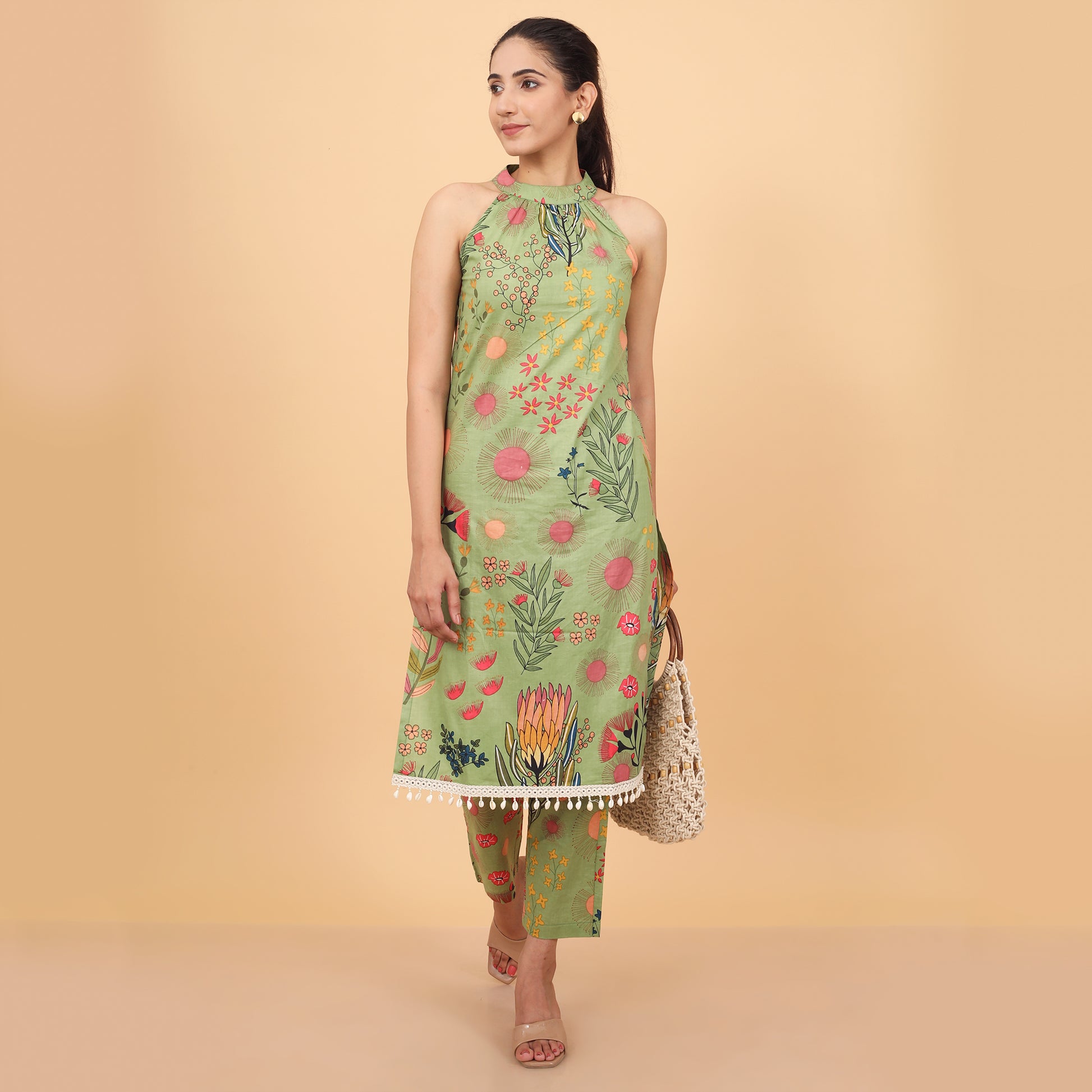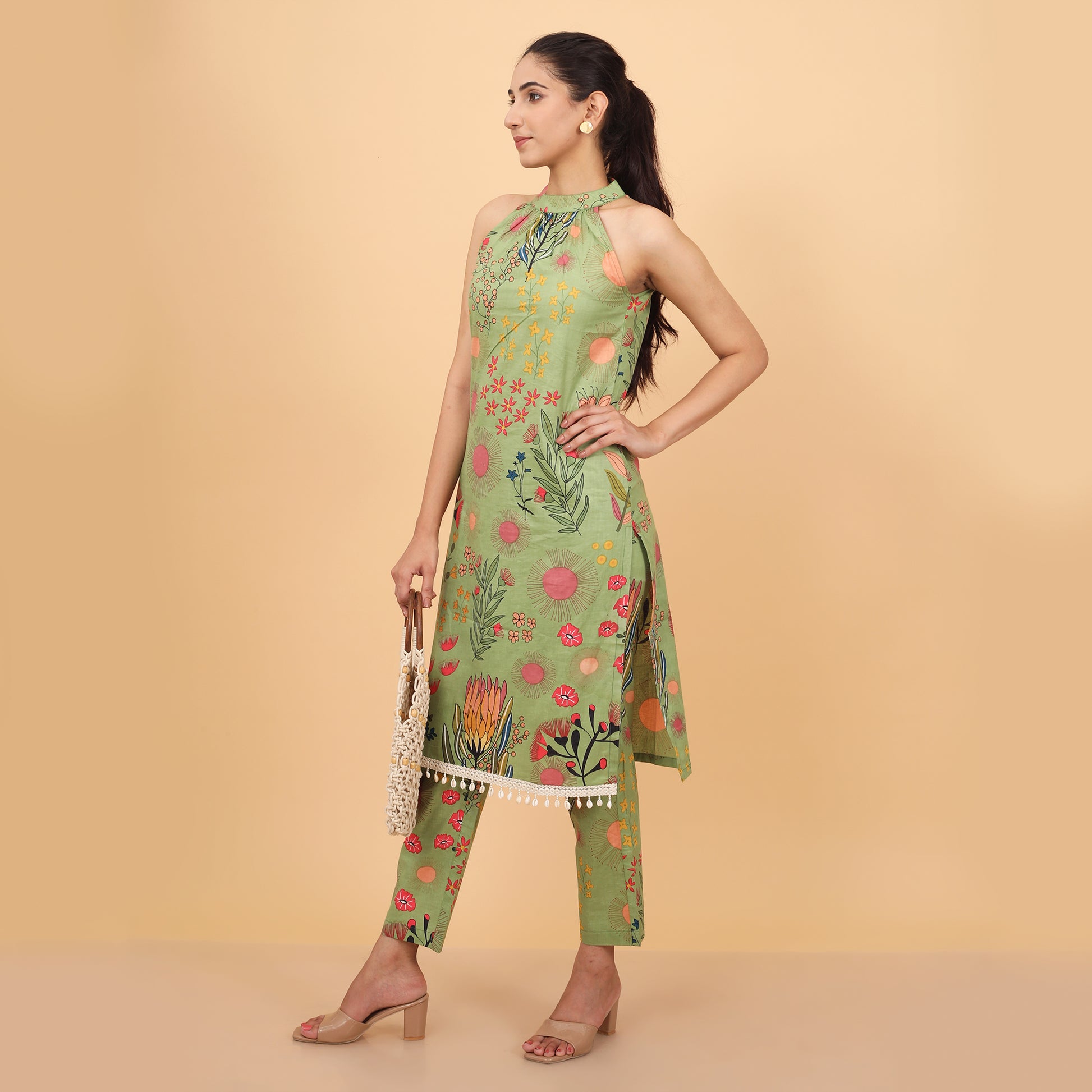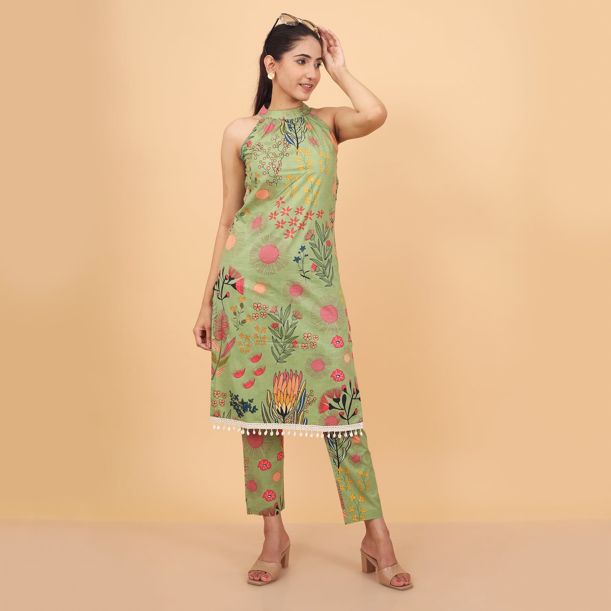 This stylish cotton halter neck kurta and pant set features a vibrant floral print and delicate shell lace detailing. Perfect for warm weather, it offers a comfortable, chic look that's ideal for any casual outing.