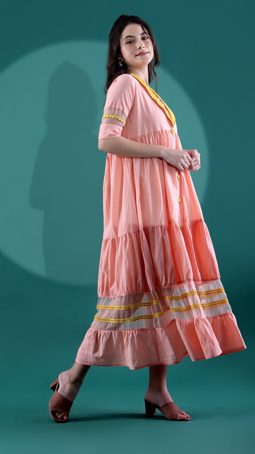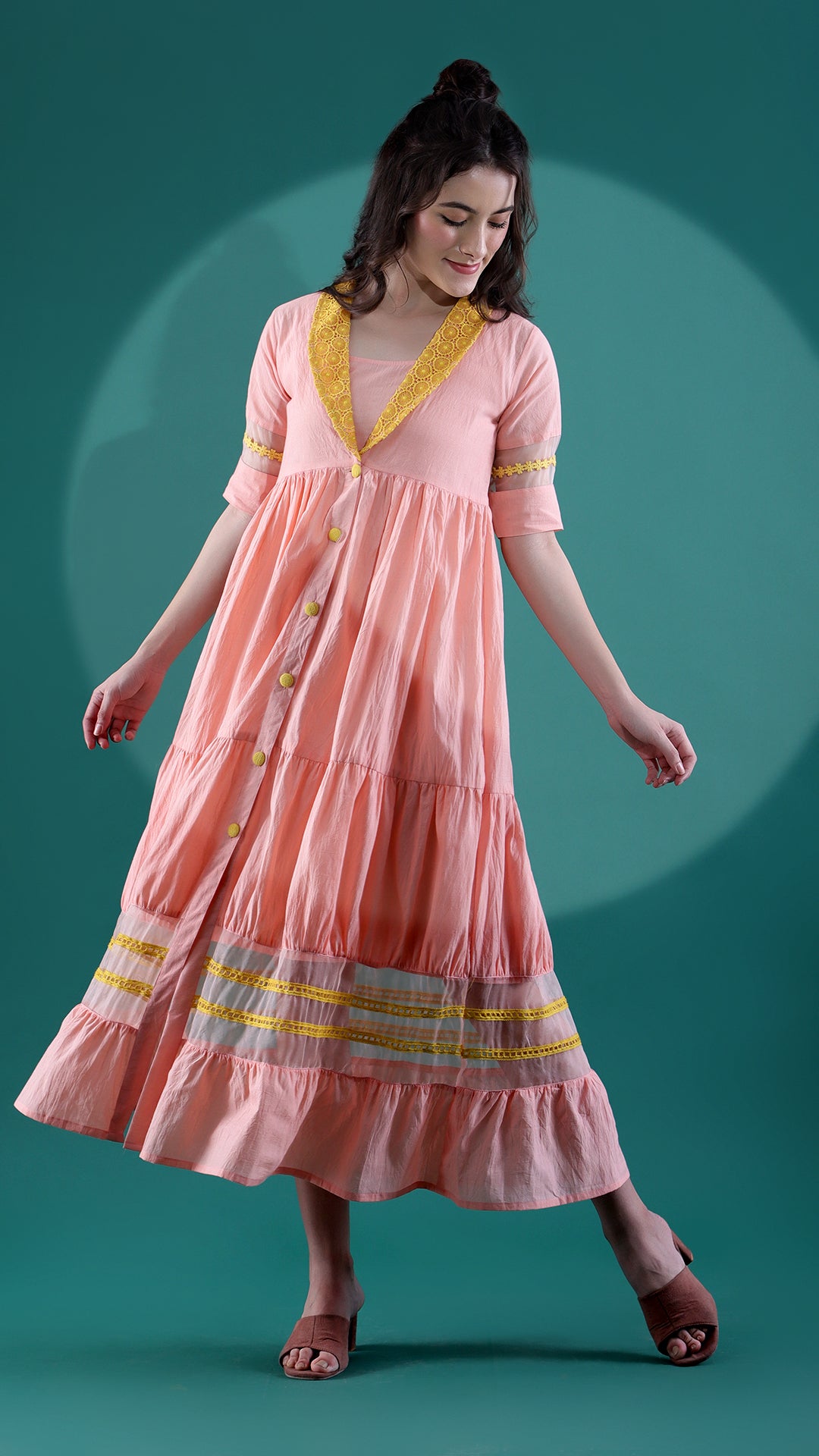 Experiment with your looks with a fuzzy Peach and mustard maxi ethnic dress. Promoting versatility, its mulmul fabric provides a comfortable space for your skin. The lace lapel collar and the lace organza detailing at the bottom successfully balance each other out. On the more creative side, the handmade button with stitched placket at the front totally steals all attention. Finer detailing includes organza laid elbow sleeves.ξ