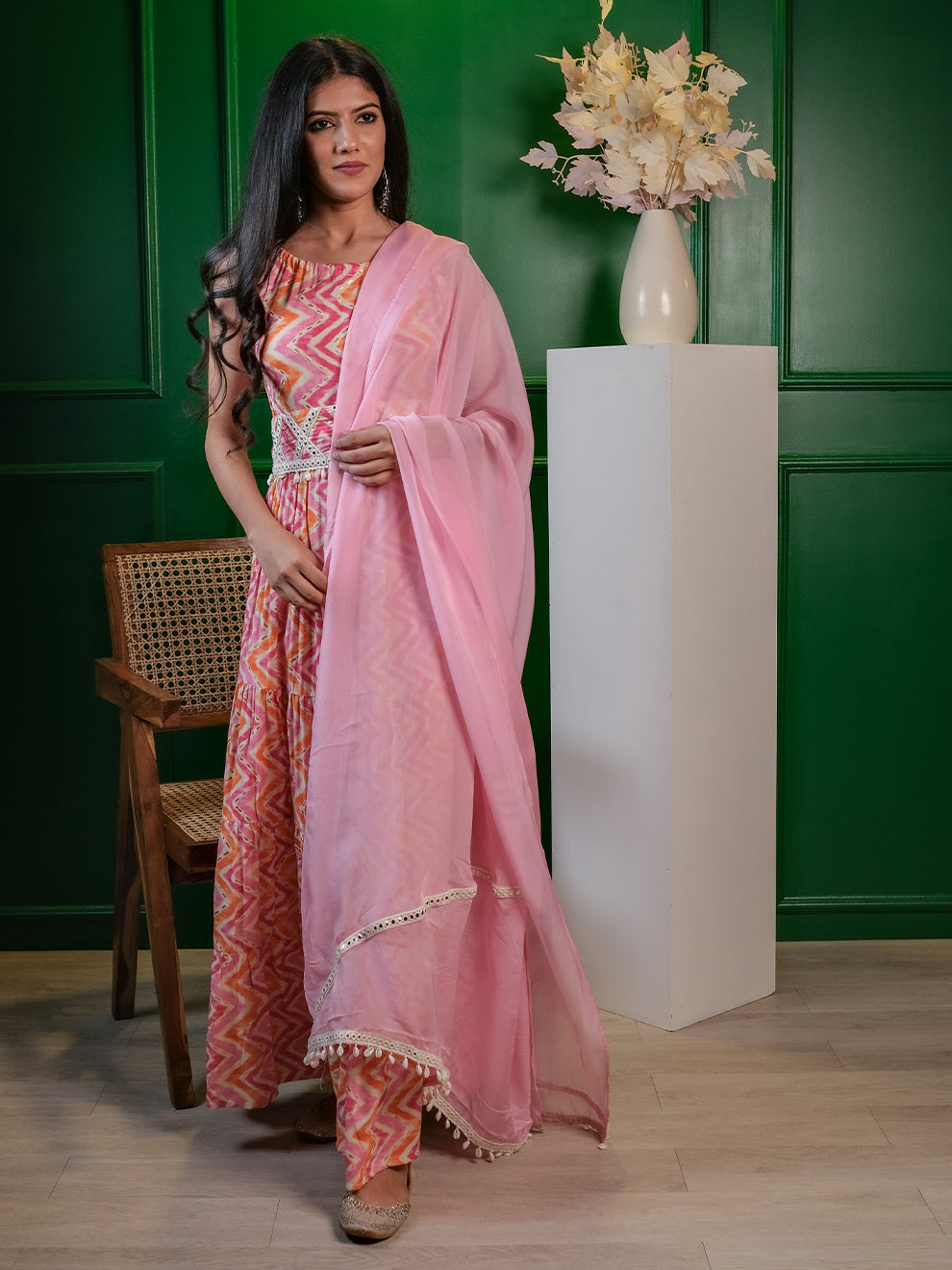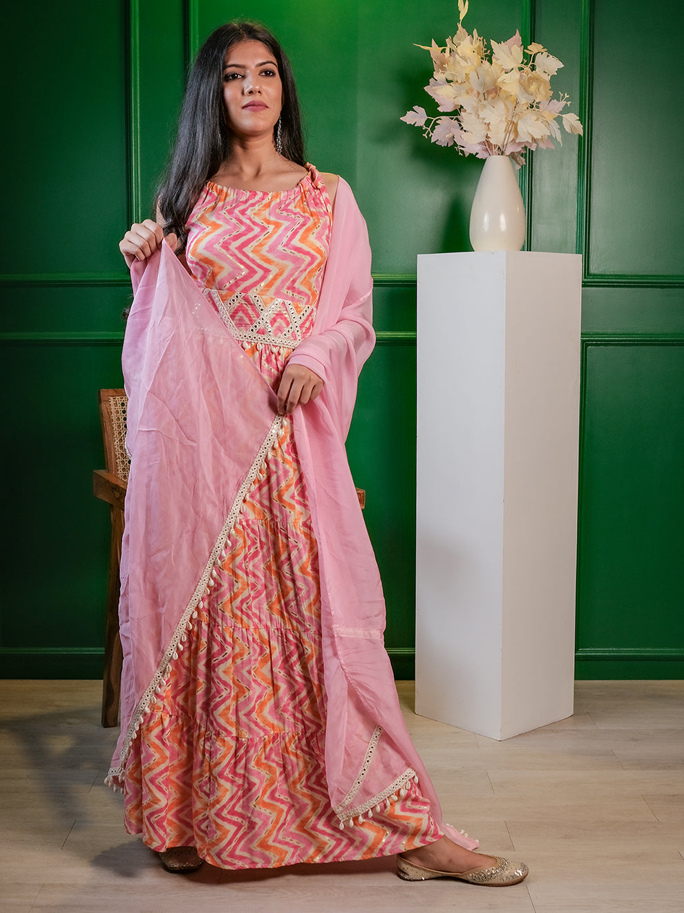 Glinting Pink Leheriya Ethnic Set with Embroidered Lace Dupatta & Belt