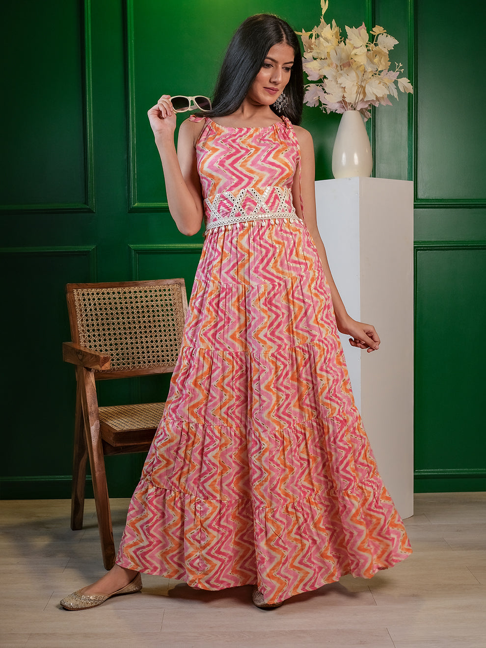 This product includes an ethnic dress, an embroidered belt and an organza dupatta with embroidered laces