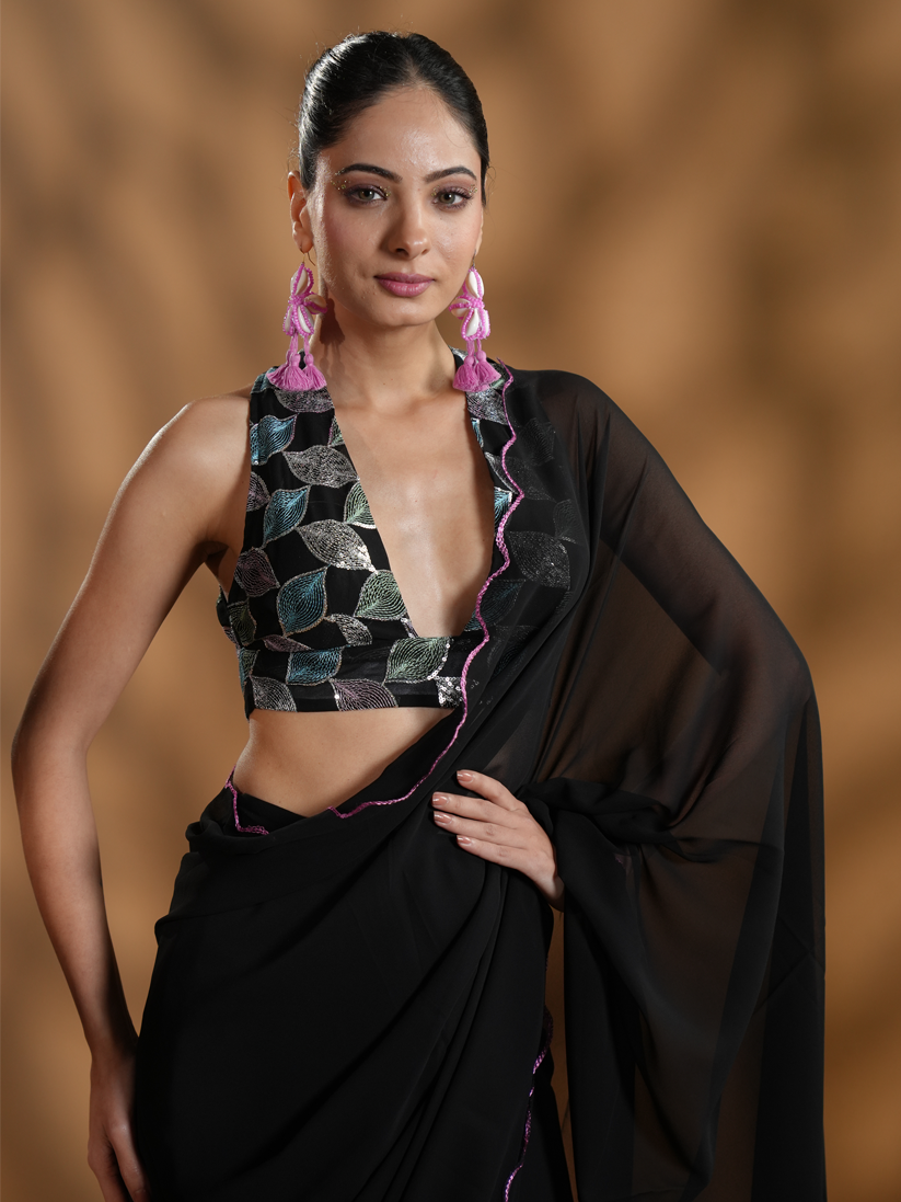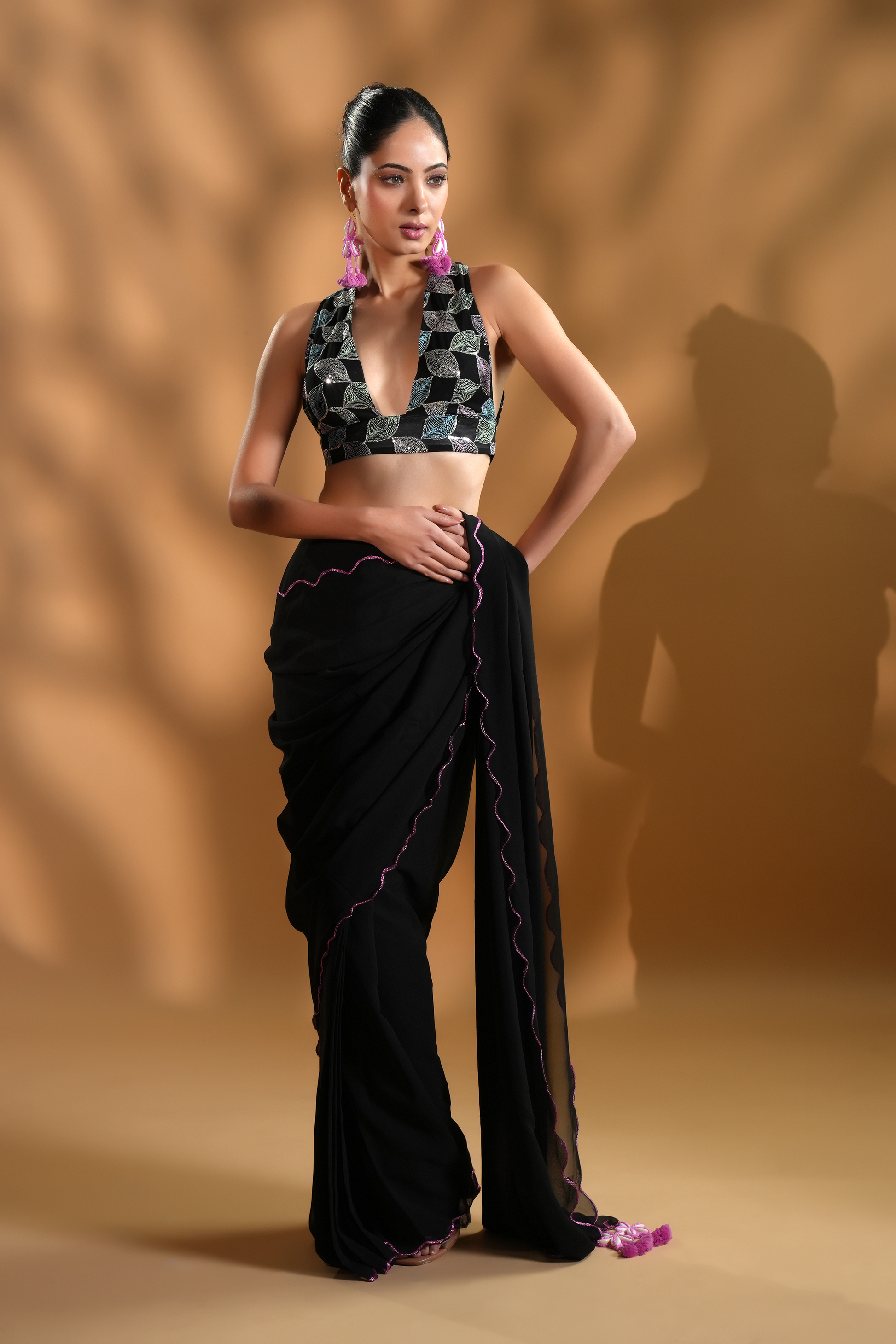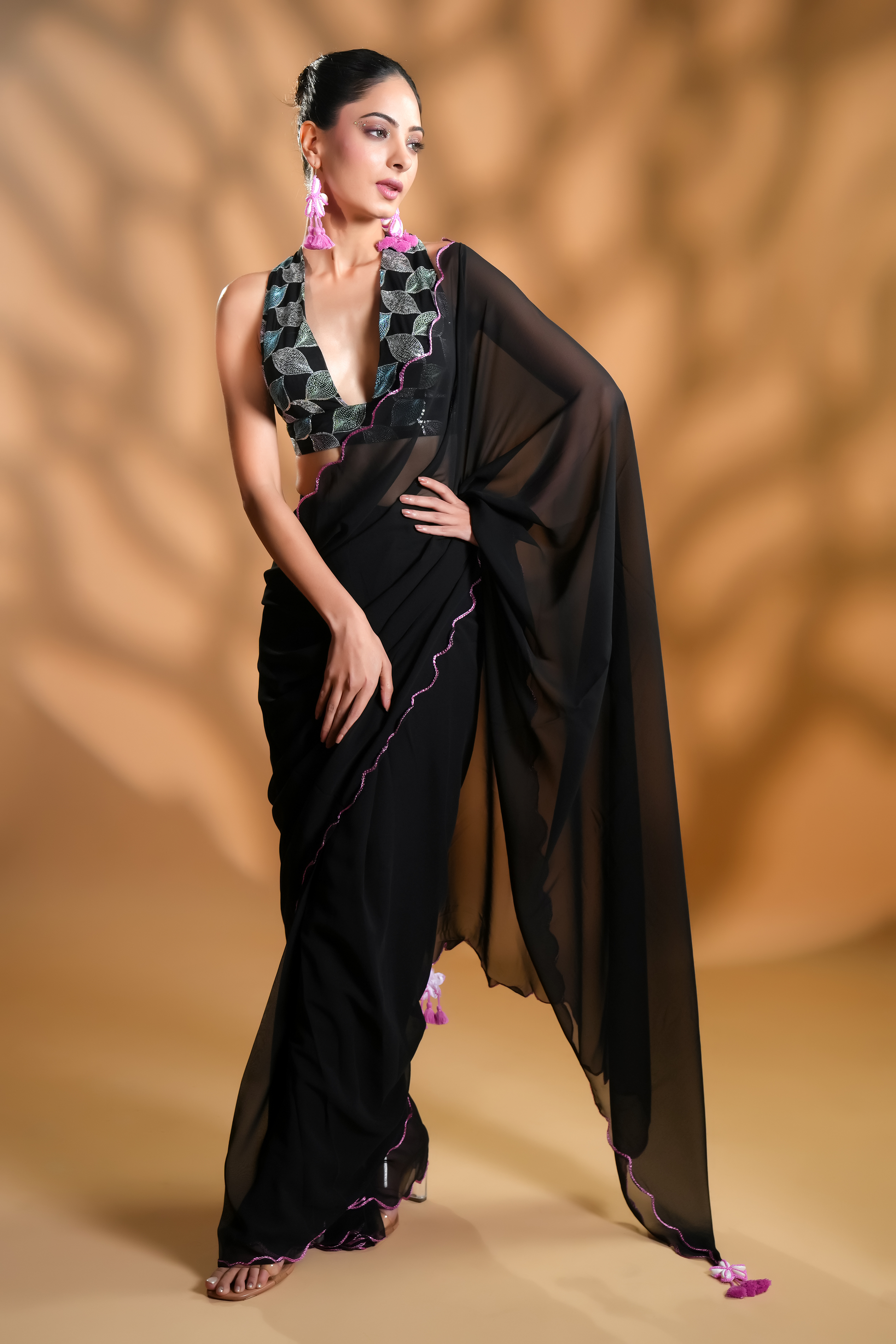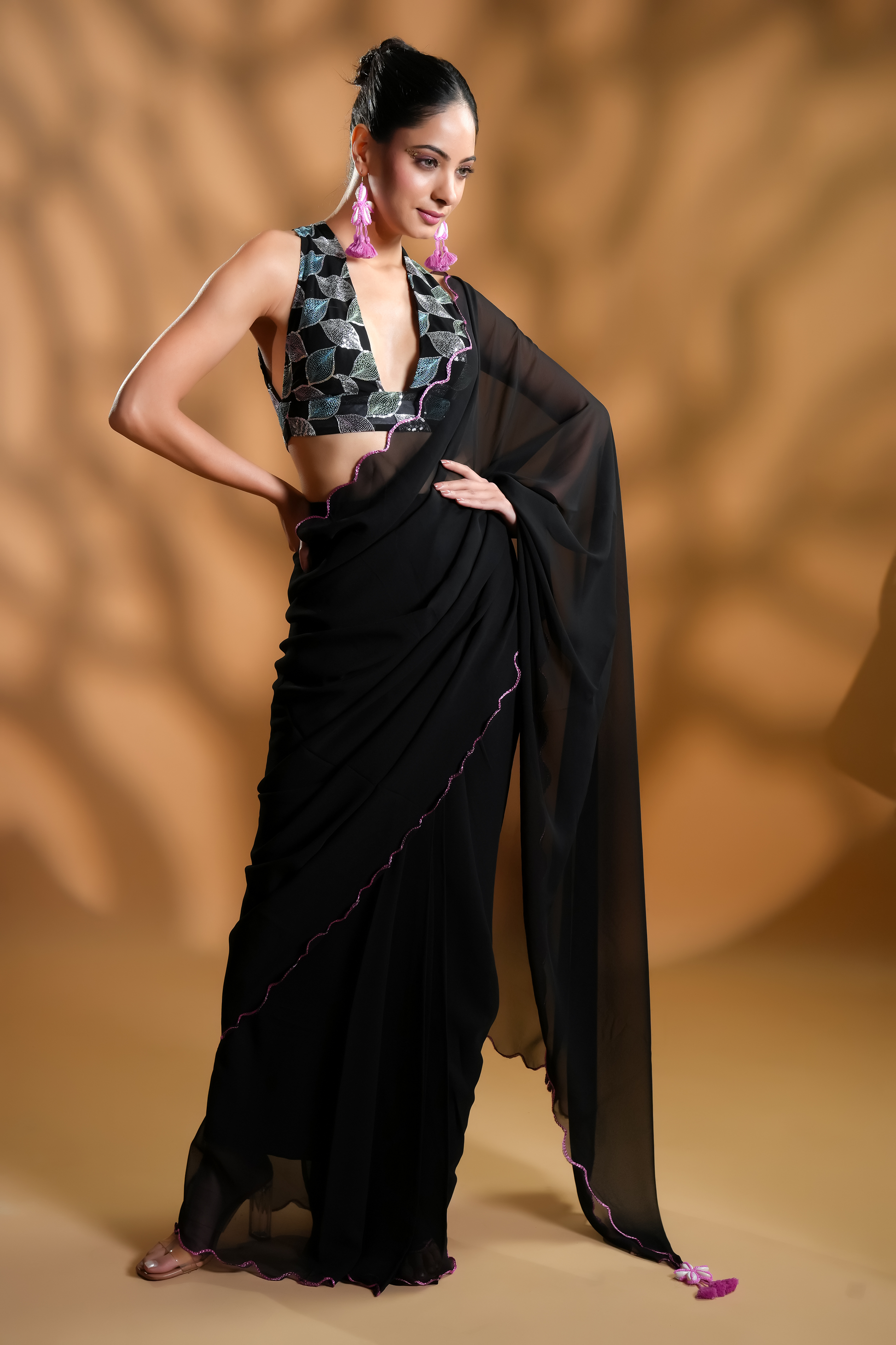 Gorgeous Black Ready to Wear Saree With Embroidered Blouse Fabric