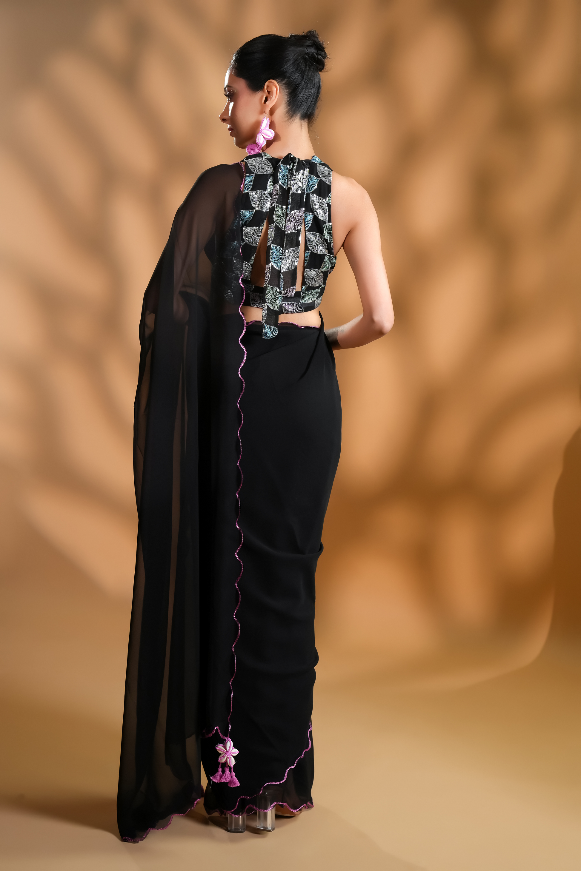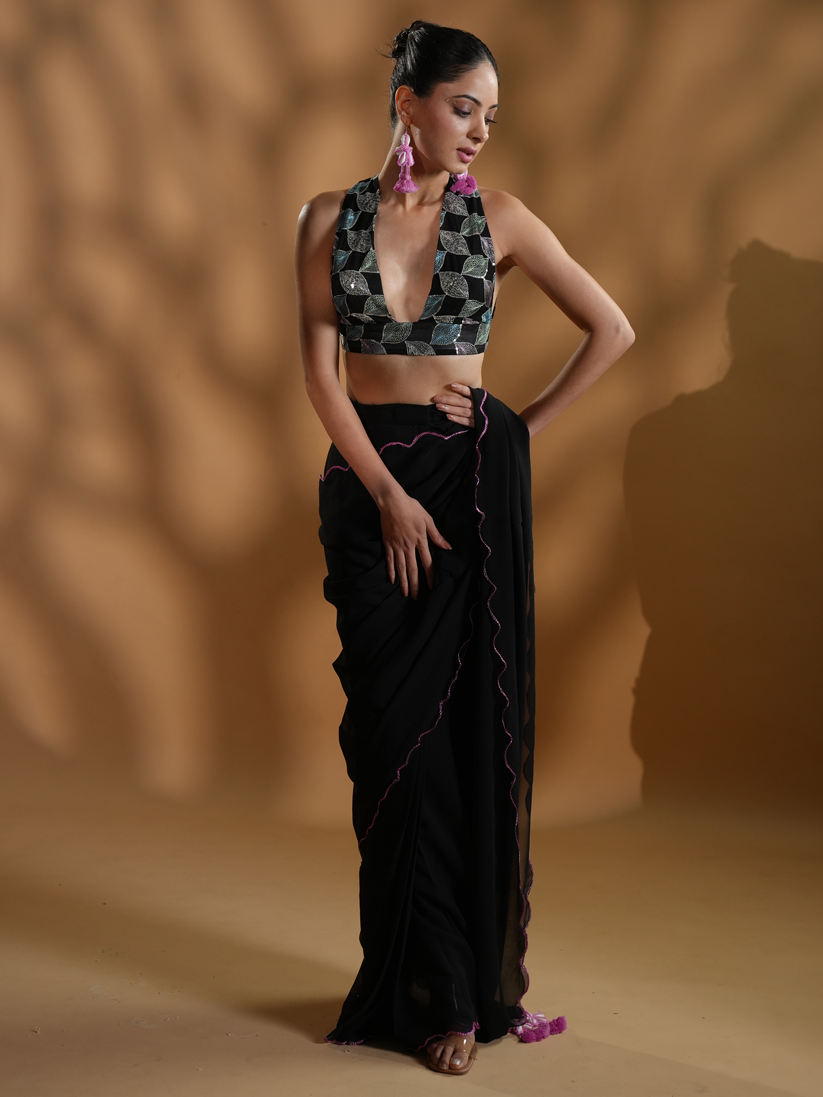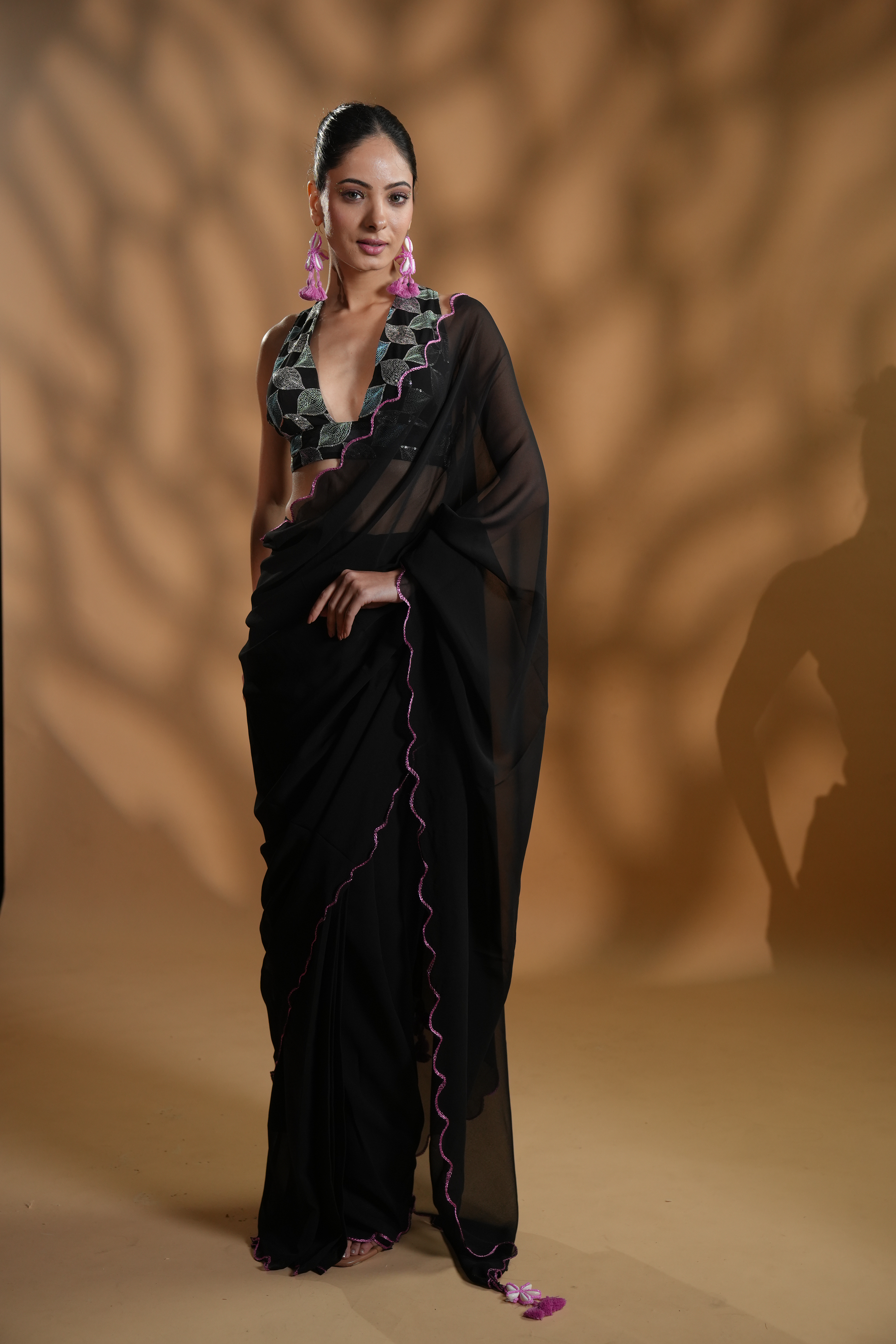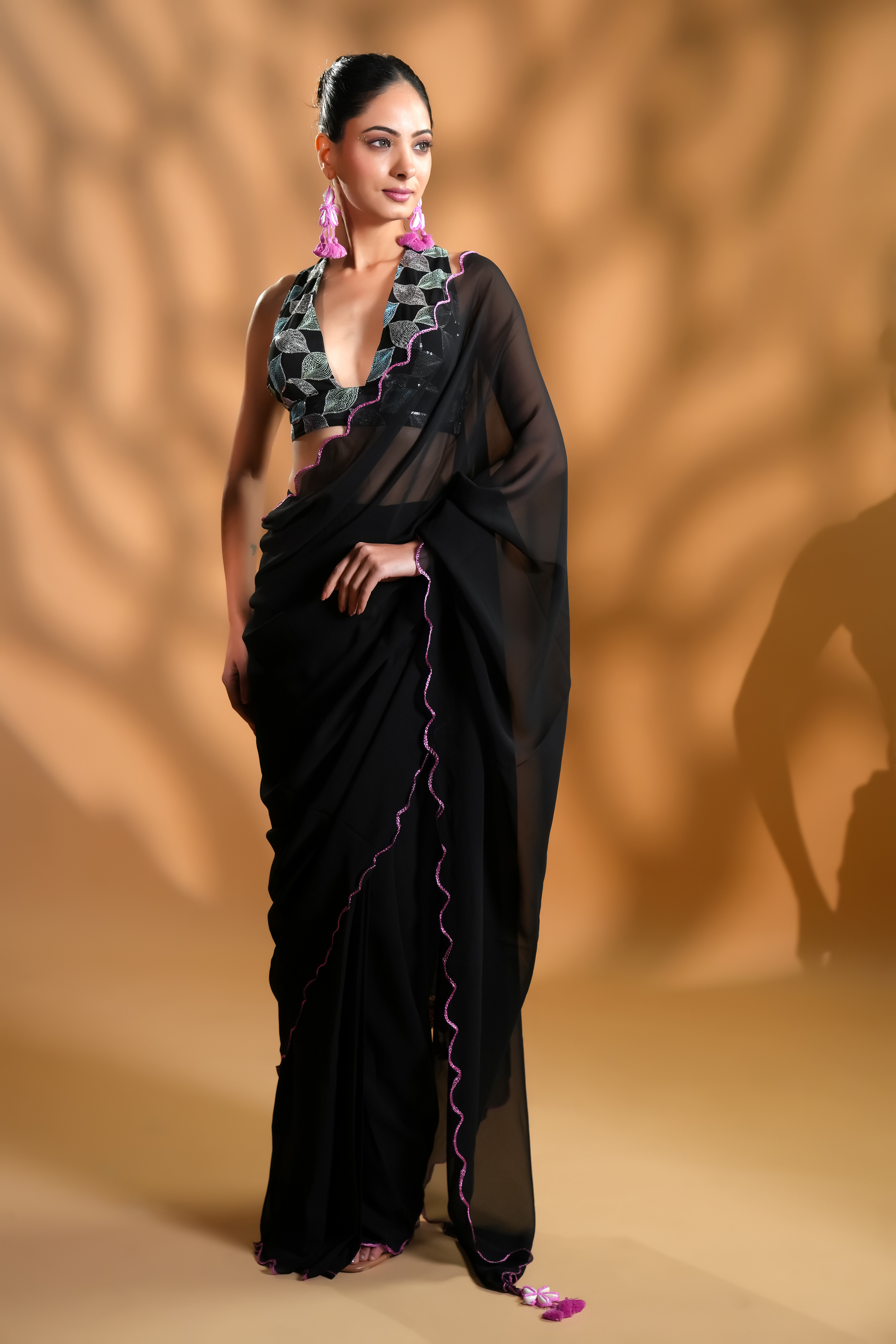 Gorgeous Black Ready to Wear Saree With Embroidered Blouse Fabric