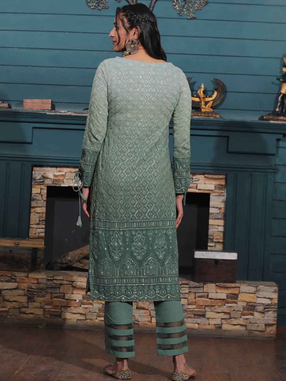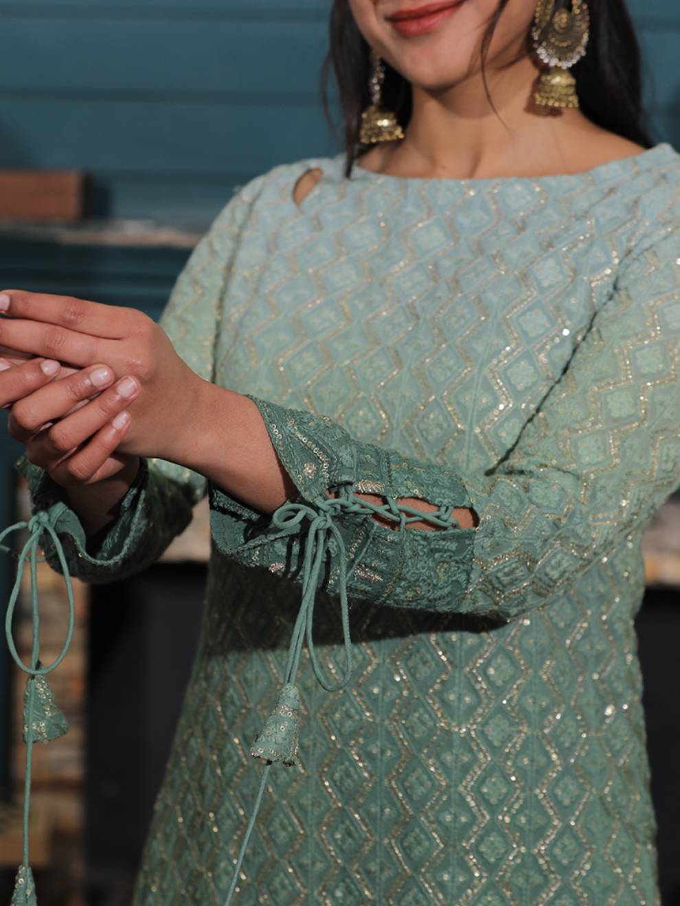 This set comprises an elegant heavy embroidered dual coloredξgreen georgette Chikankari kurta with a boat neck, knot details on the sleeves and pants with organza details on the bottom. Pair this gorgeous ensemble with a brightly coloured dupatta and a pair of khussas to finish off its ethnic look.