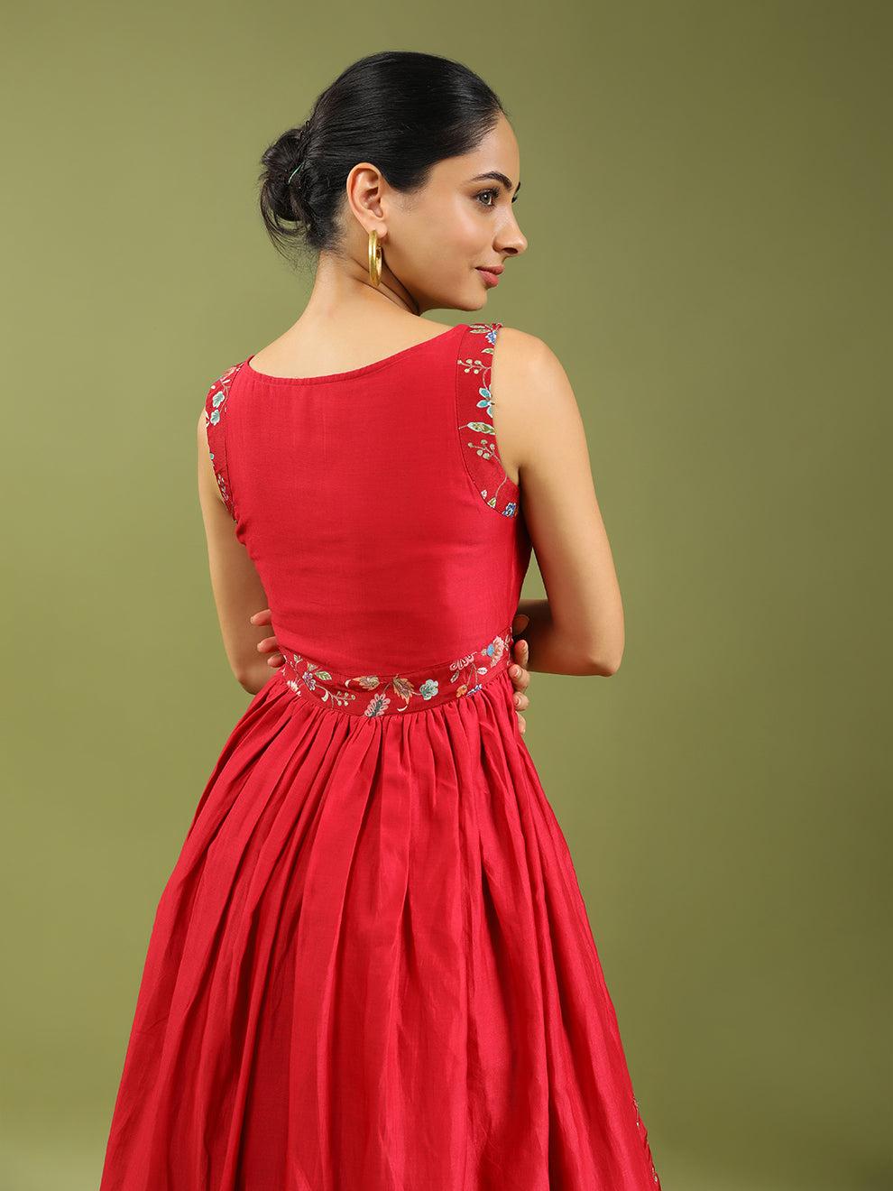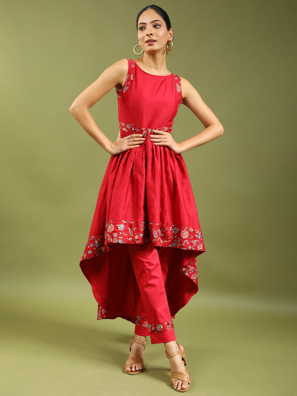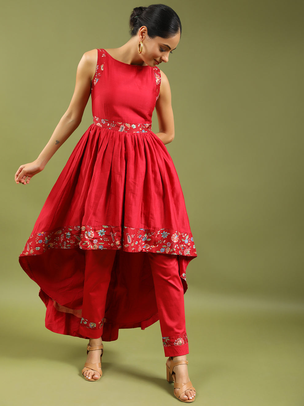 Dazzling outfit is a must buy for all females. Make a powerful fashion statement in this designer red ethnic dress with Pants. For a festive occasion, this chanderi silk solid and printed embroidery outfit will make your beauty admirable. Sleeveless and a bright color combination of this high-low dress with pants have a unique look.