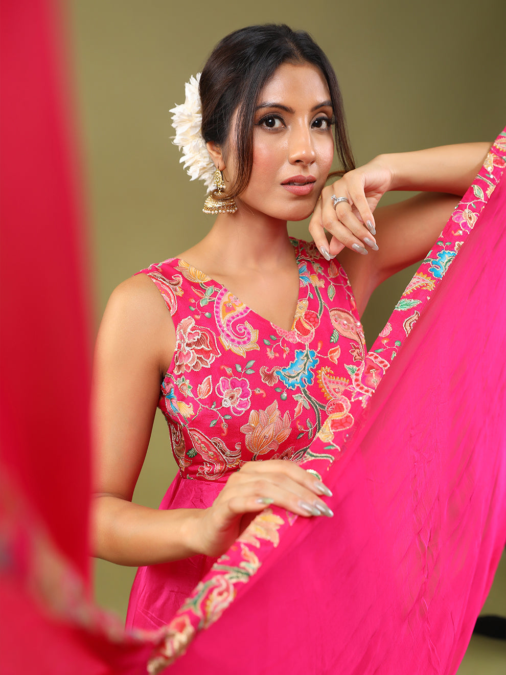The buzz, the latest muse, and the trend down the road are something that every woman follows. This hot pink floral hand embroidered anarkali set with V-neckline in chinon or upada silk will give you an exclusive fresh look. Itäó»s time to welcome to the new age of Indian fashion with matchless hand embroidery. Upada silk bottoms and a chiffon dupatta will restyle your senses.