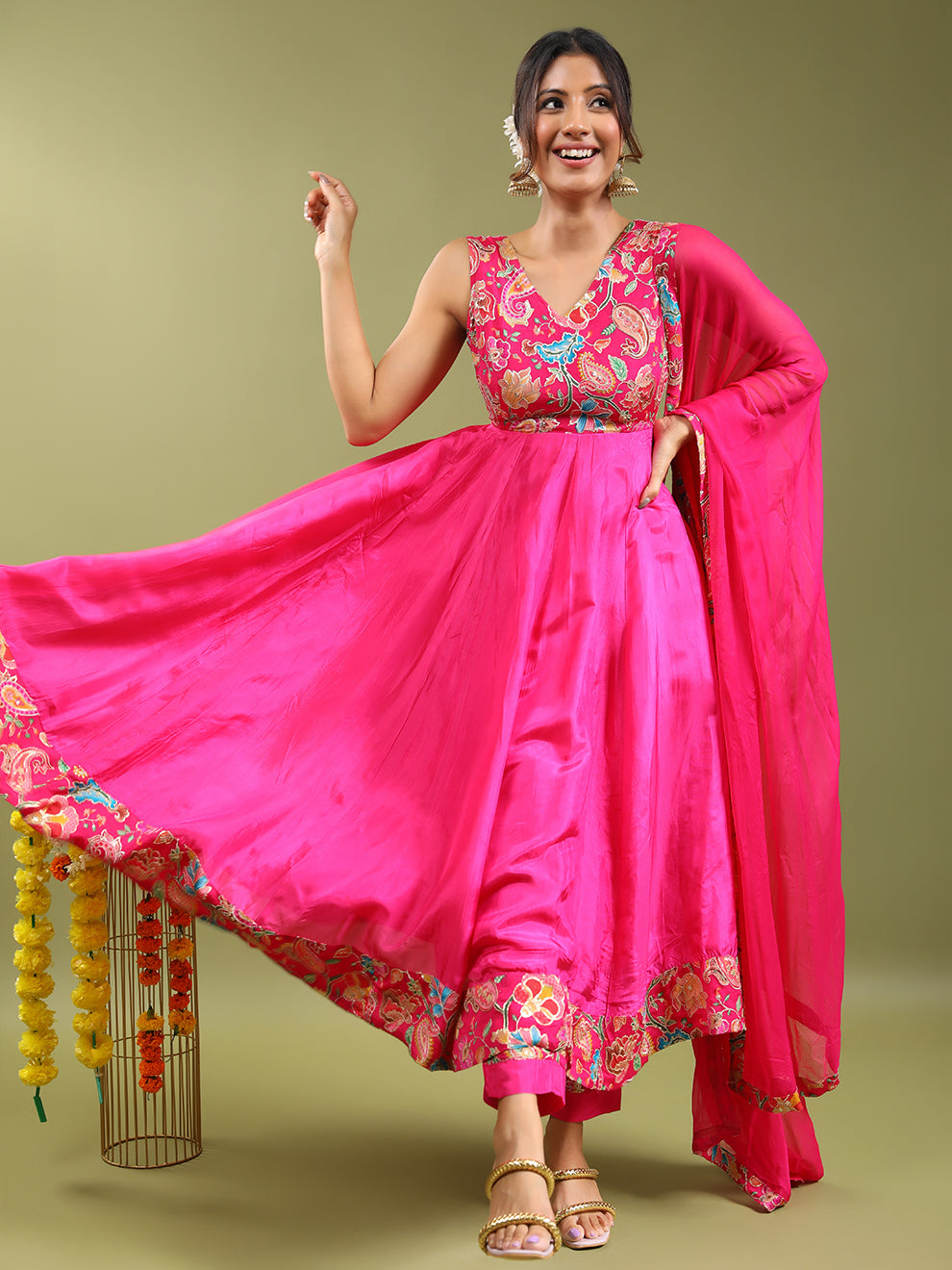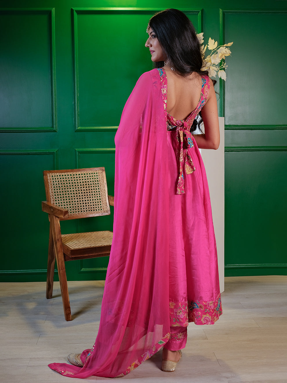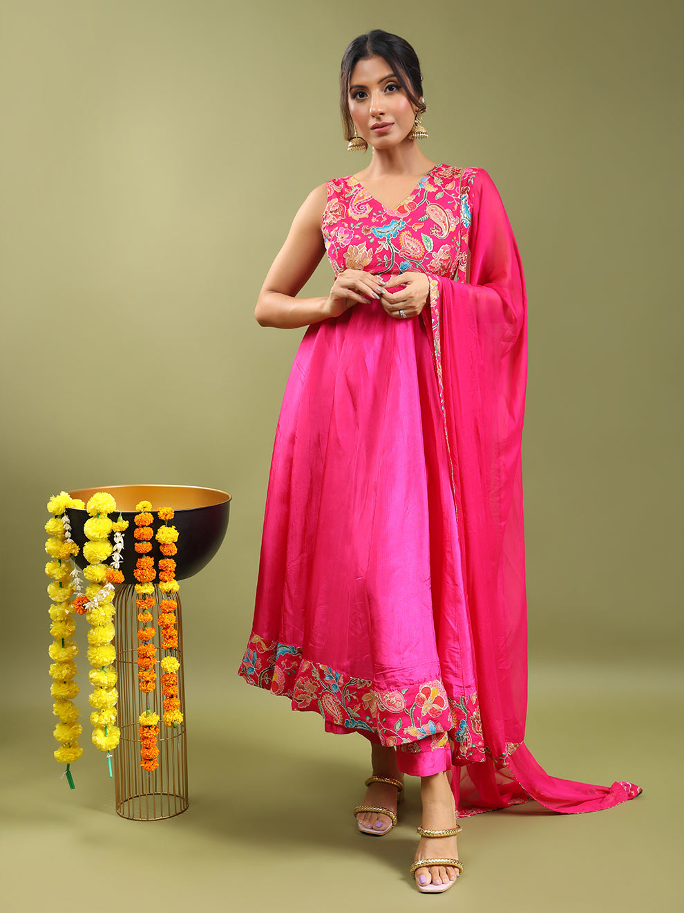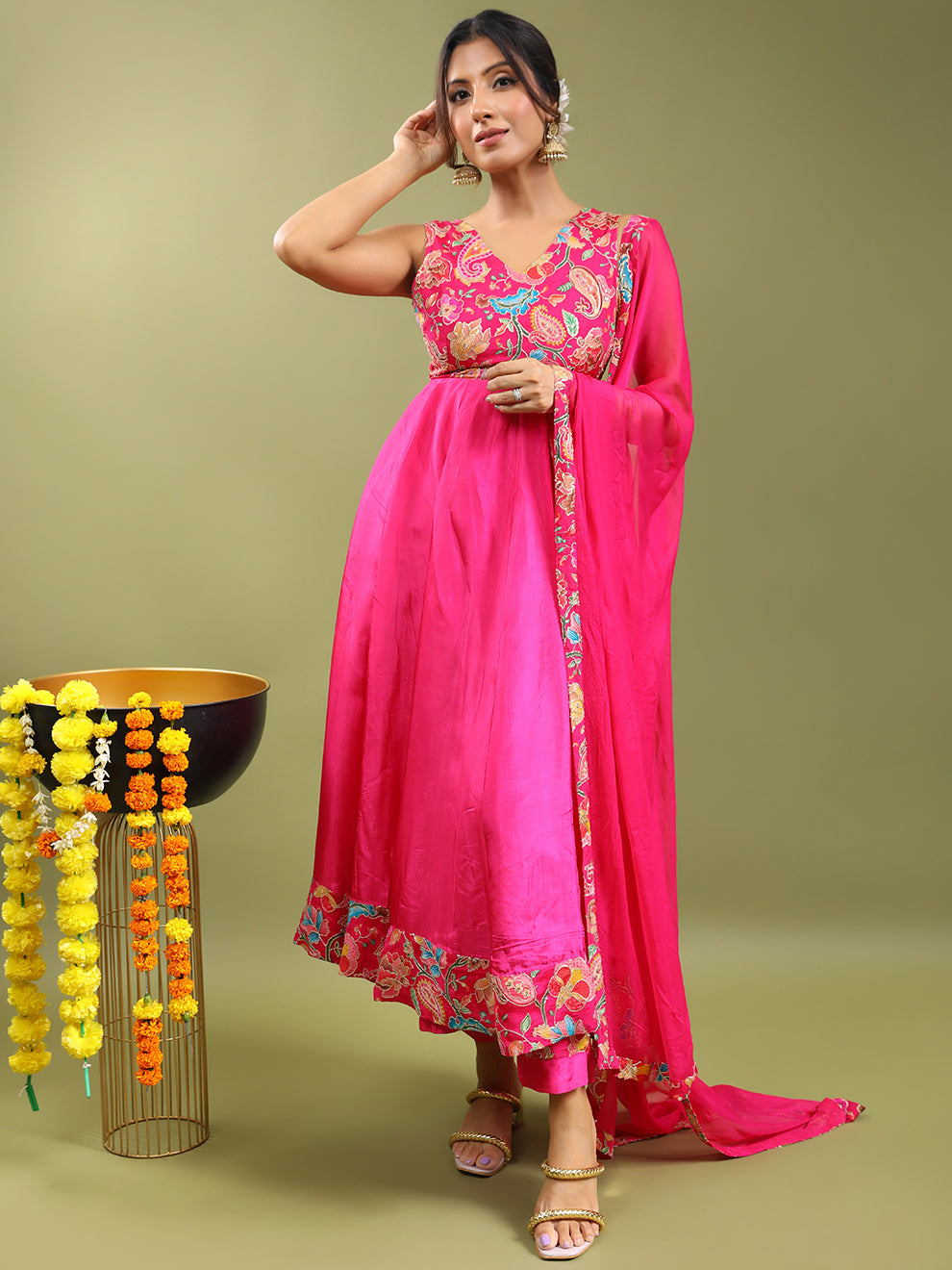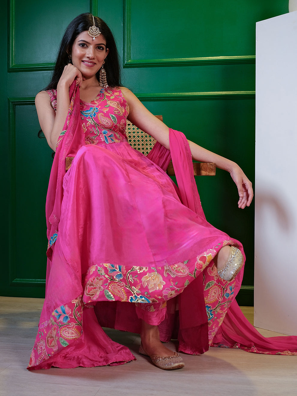 Hot Pink Floral Embroidered Anarkali Set (Set of 3)
